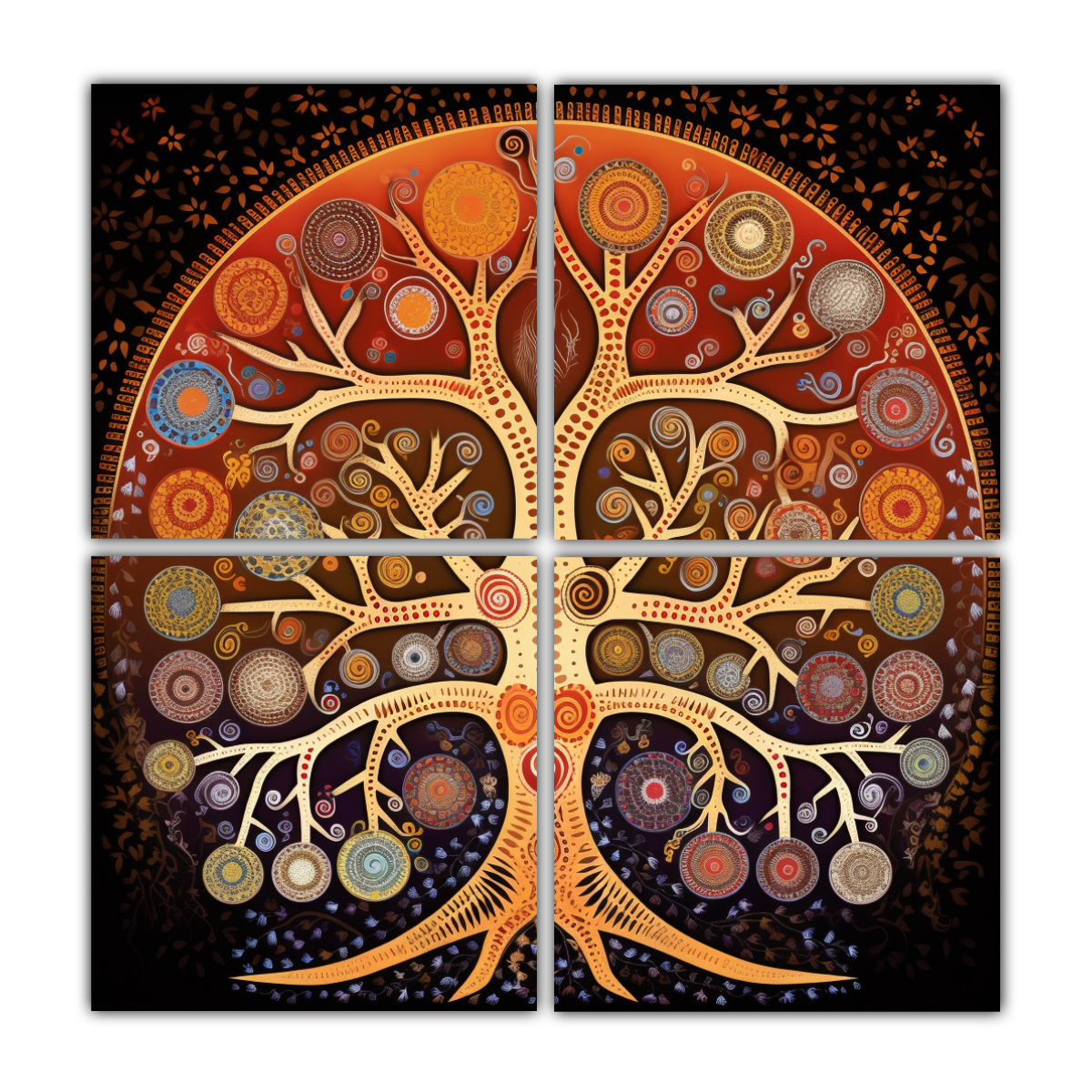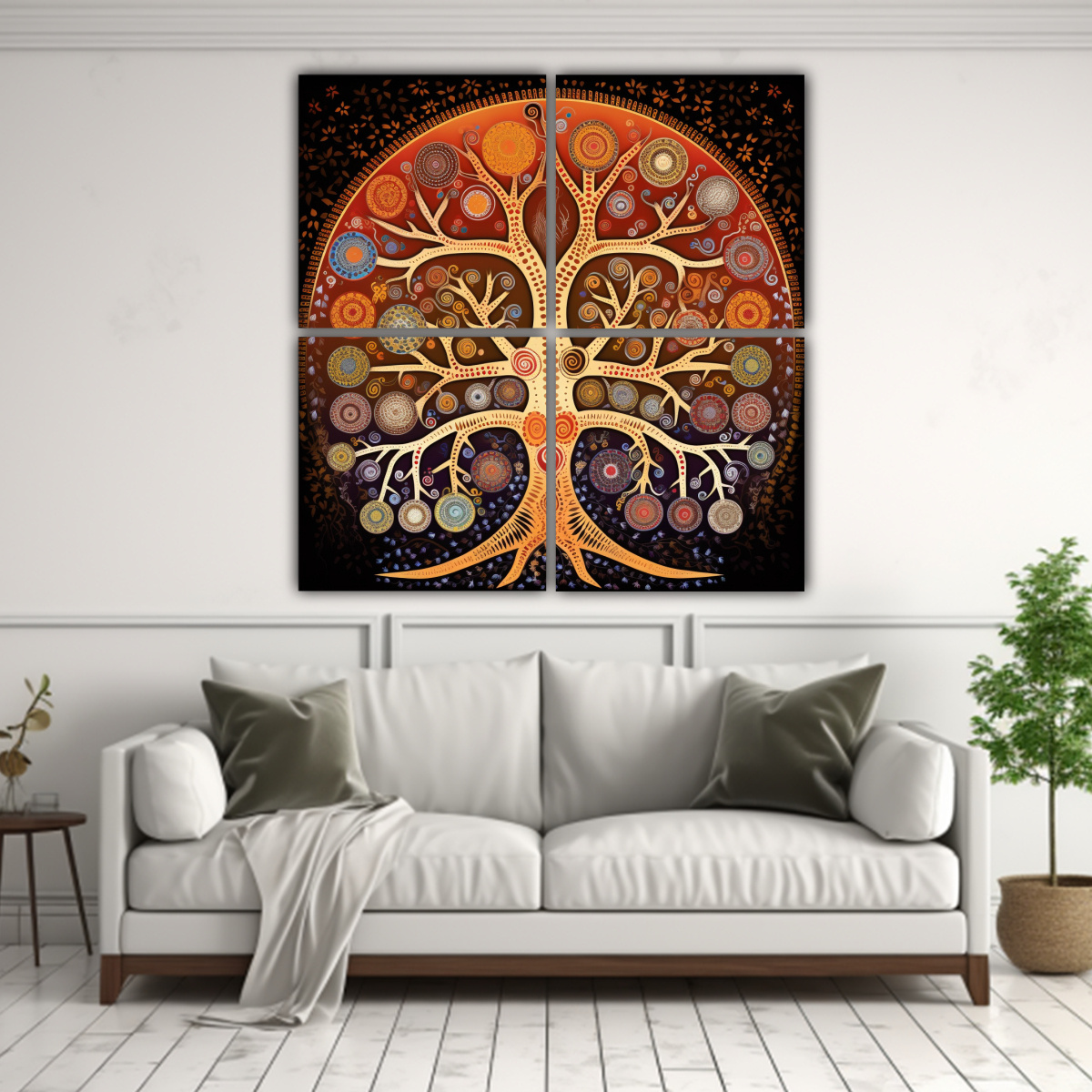 Cuatro Lienzos De Tela Tela Sublimada Con Concepto Del Árbol De Merkle Representado En Pinturas Aborígenes Australianas Para La Decoración De Sala