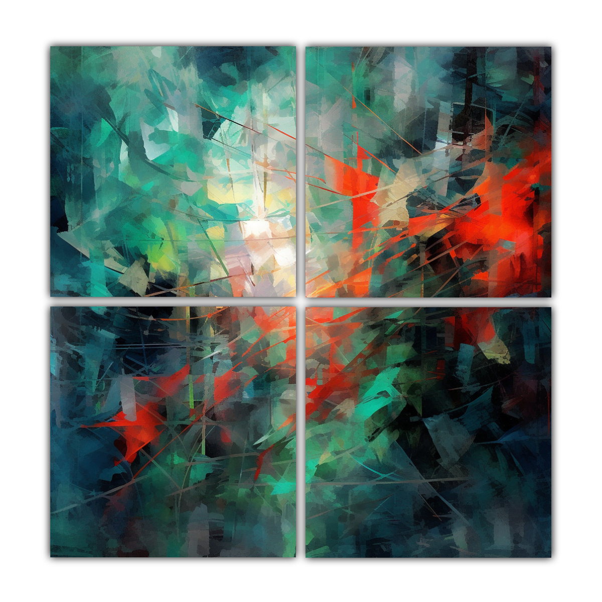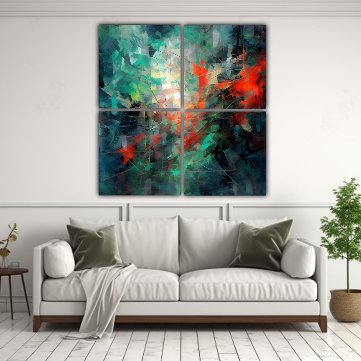 Los Cuatro Lienzos De Tela Vanguardia Exposición son una obra de arte abstracta en tonos rojo, azul y verde Confeccionados en tela de alta calidad con bastidores de madera Compra ahora en DecoCuadros y lleva la vanguardia a tu hogar
