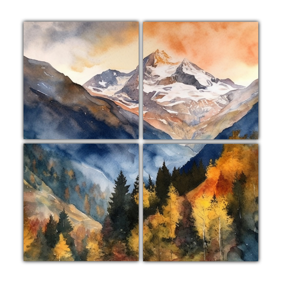 Decora tu hogar con los Cuatro Lienzos De Tela Abstracción Living Swiss Alps in watercolor de DecoCuadros Alta calidad y precios económicos Entregas rápidas y gratuitas en Santiago Envíos express a regiones