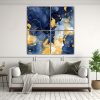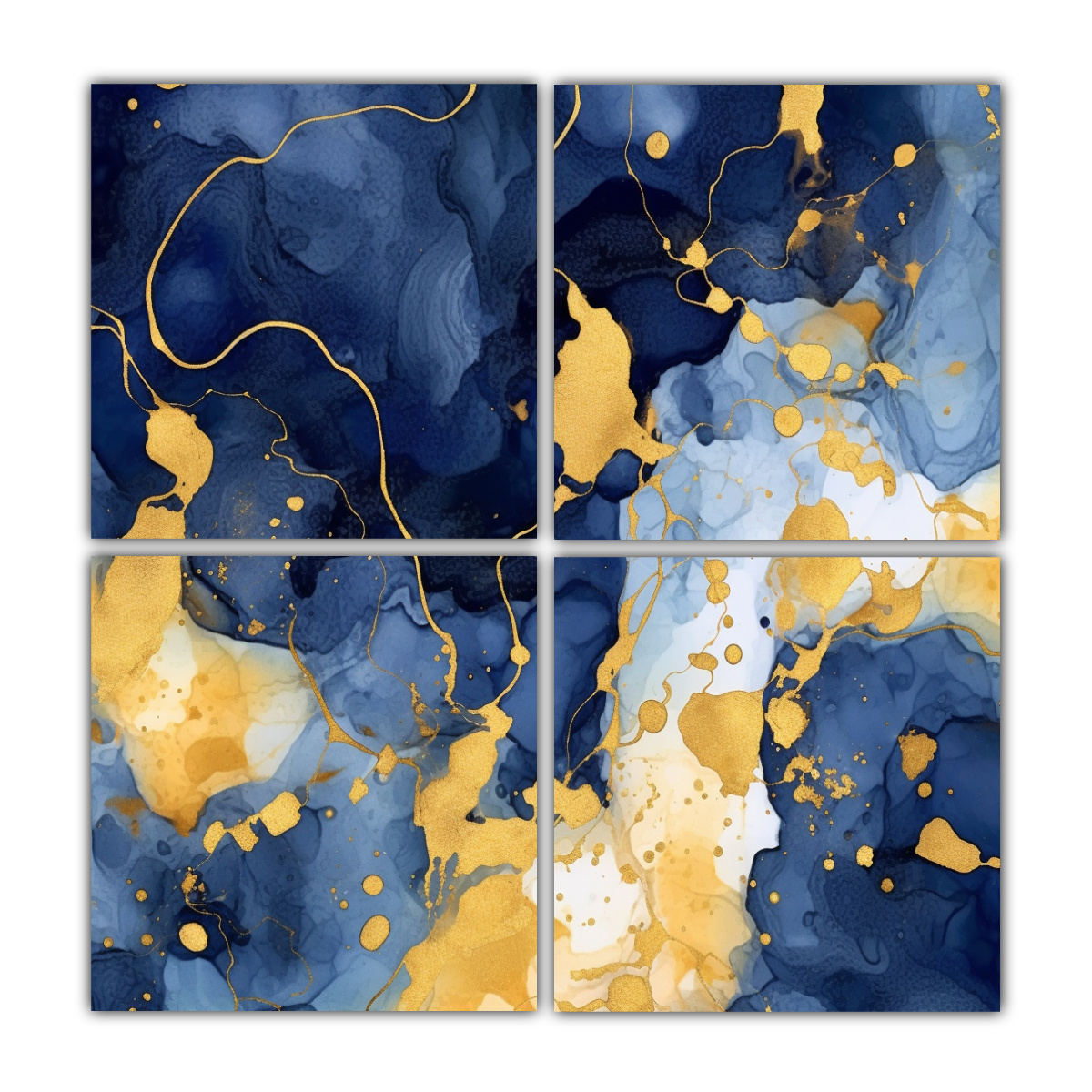 DecoCuadros presenta el Cuadro 4 Telas en Bastidor, una obra con una espectacular belleza natural en tonos azul marino y dorado Impreso en tela de alta calidad con un bastidor de madera resistente, este cuadro es perfecto para agregar un toque elegante y sofisticado a cualquier espacio Su textura de tinta al alcohol transparente crea un efecto único y llamativo