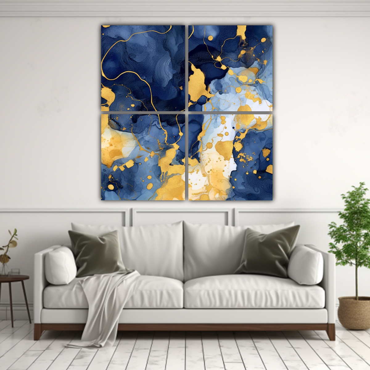 Cuatro Telas En Bastidor: Belleza Natural En Tonos Azul Marino Y Dorado Con Textura De Tinta Al Alcohol Transparente.