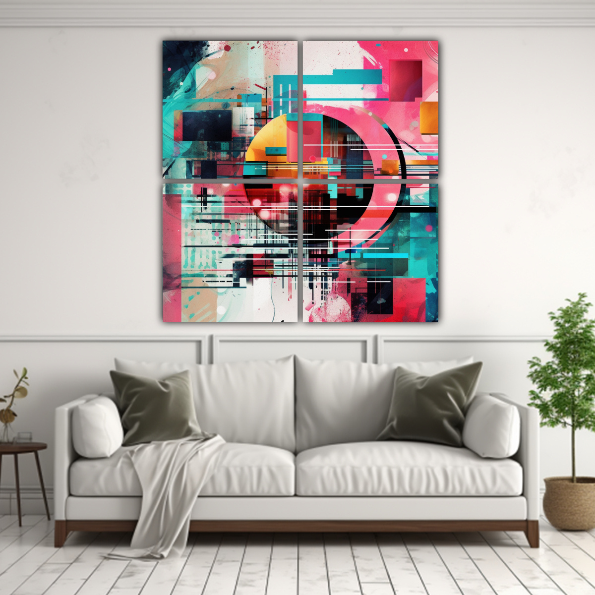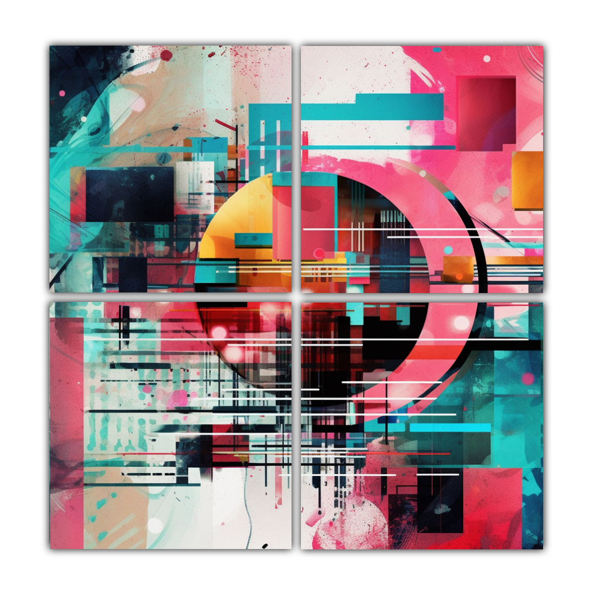 Create una pieza experimental que explore la combinación de colores Plateado, Carmesi, Azul Marino grisaceo, Coral, Menta, Verde Azulado, Turquesa y Gris con nuestro cuadro ‘Cuatro Telas en Bastidor de Colorido Espectacular I Digital Dreams’ DecoCuadros ofrece la mejor calidad en cuadros decorativos impresos en tela con bastidores de madera, y los precios más económicos del mercado Además, contamos con diseños exclusivos, entregas rápidas y envíos gratis en Santiago y envíos express a regiones