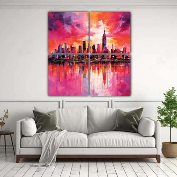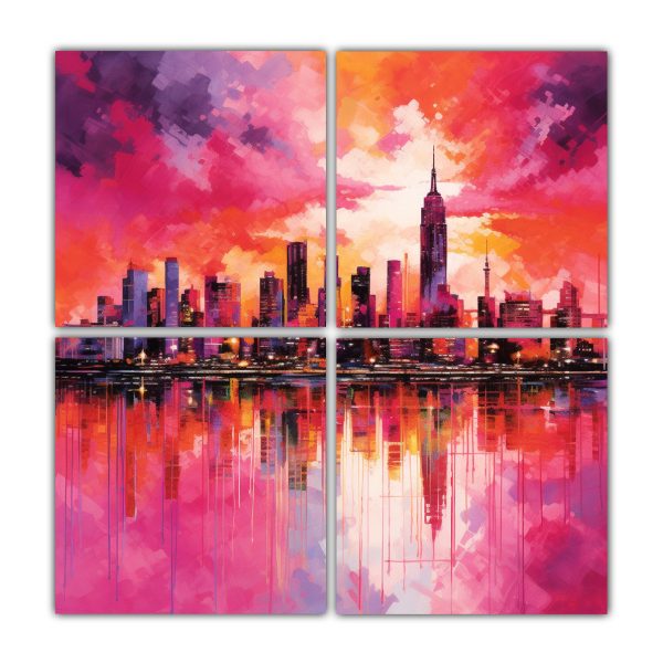 Cuatro Telas En Bastidor Patrón Intenso Exhibición De Impresión Del Horizonte De Nueva York En Tonos Rosas Vibrantes Para Decoración Pinturas