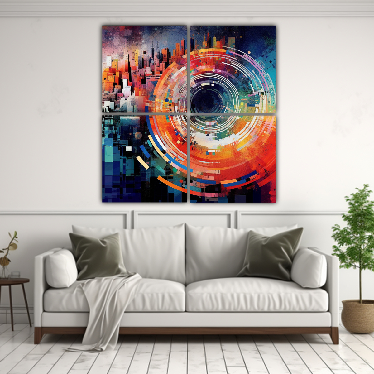 Este cuadro es perfecto para decorar tu sala de estar o comedor Combínalo con tonos neutros como el blanco o el beige en las paredes, muebles y accesorios, para resaltar la vibrante paleta de colores del cuadro Colócalo en una pared central para que sea el punto focal de la habitación y añade detalles decorativos en tonos complementarios como cojines o cortinas ¡Crea un ambiente moderno y sofisticado con los Cuatro Telas Sublimadas Texturizadas de DecoCuadros!