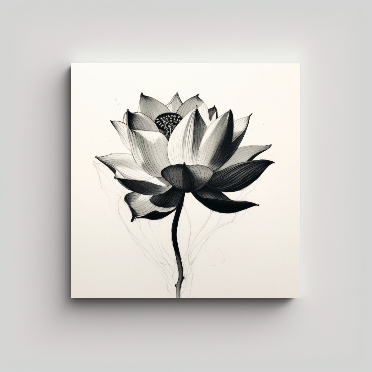 Dibujo Artesanal De Loto En Tinta: Detalle En Negrita En Bastidor