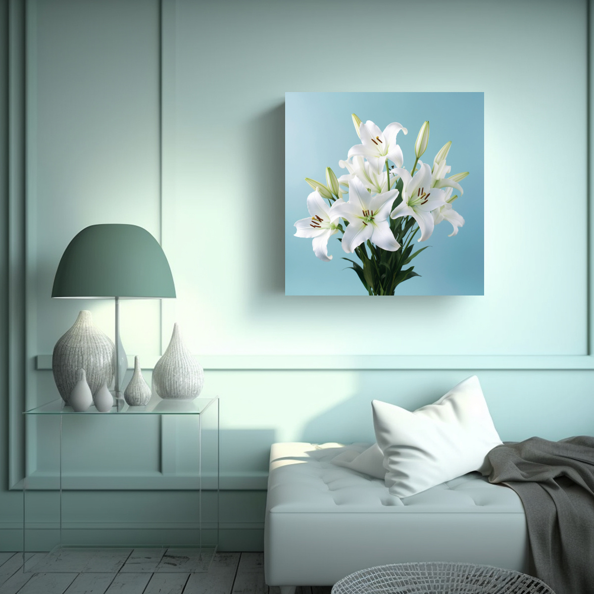 Dibujo Surrealista Arte De Pared Con Bouquet De Lirios Blancos Fondo Azul