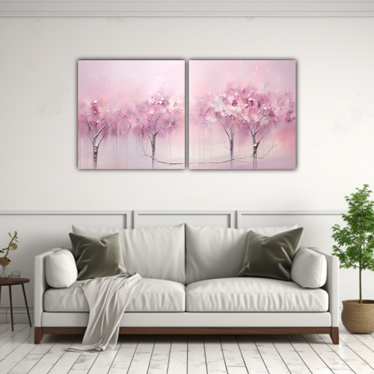Este diptico acuarela Armonía cromática en rosa y plata quedará perfecto en tu salón o dormitorio, creando un ambiente sereno y sofisticado Combínalo con muebles blancos o grises para resaltar su belleza y añade cojines en tonos lila o beige para lograr una armonía cromática completa