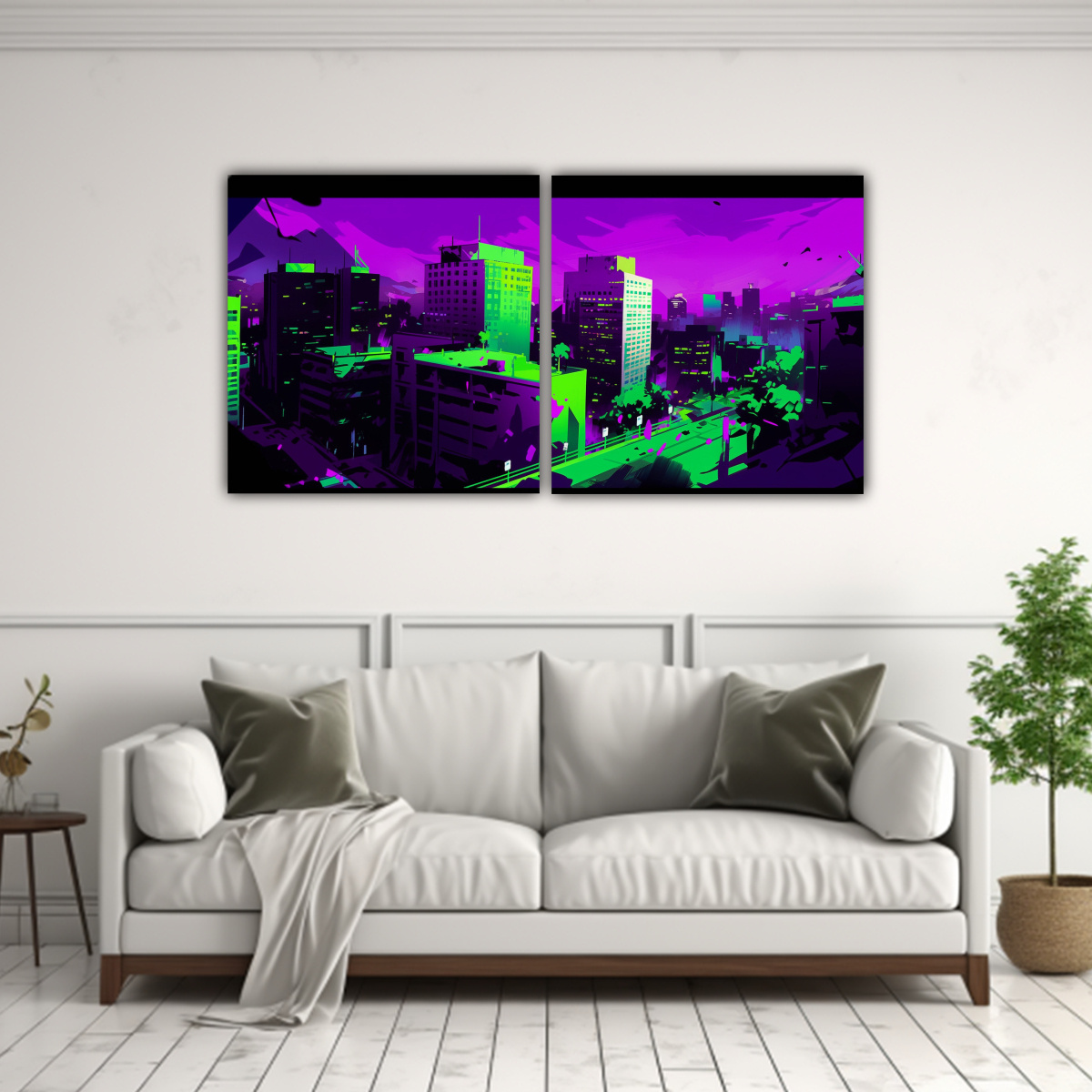 Este díptico se vería espectacular en una sala de estar de estilo contemporáneo Colócalo sobre un sofá gris para resaltar los tonos vibrantes de la obra, creando un ambiente único y sofisticado