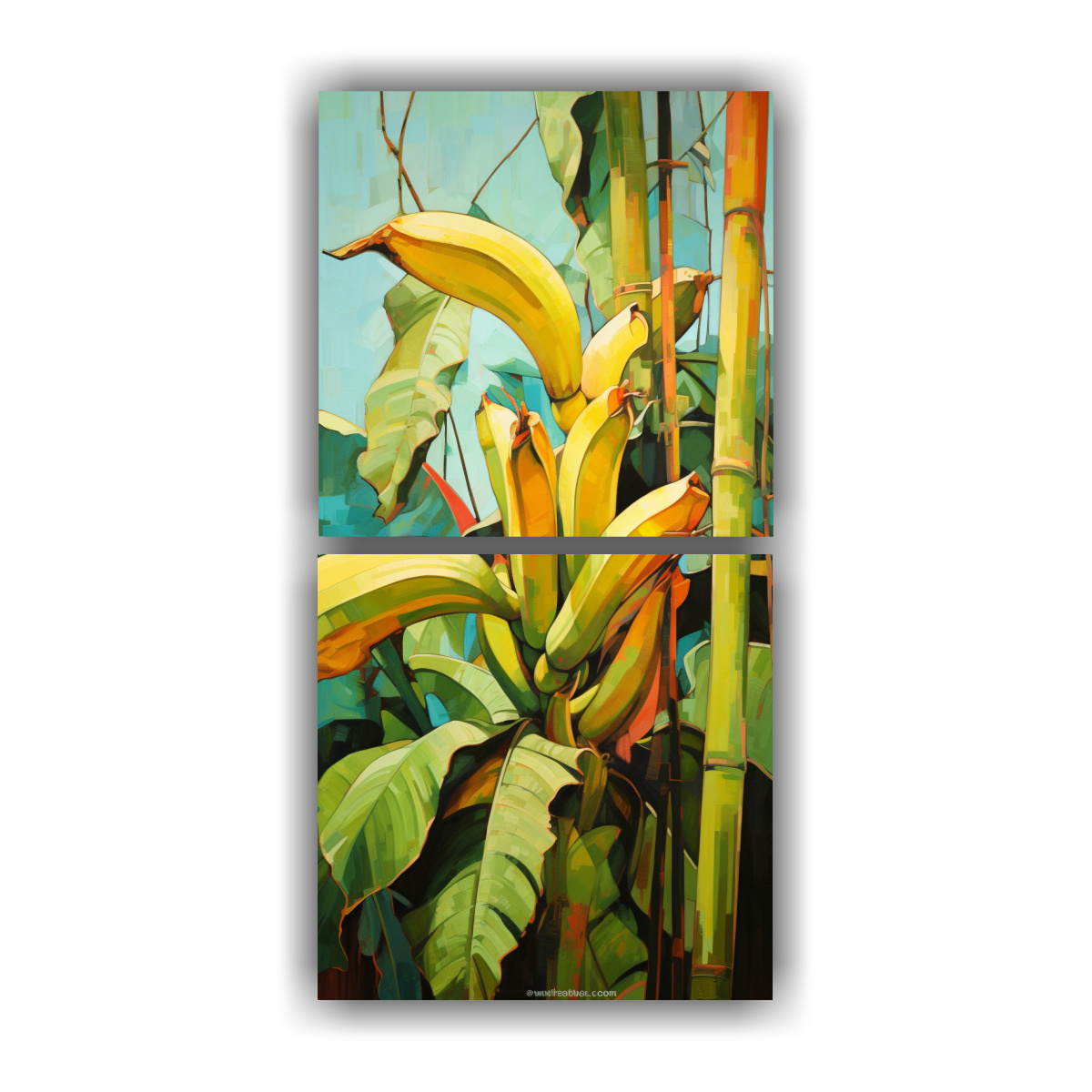Diptico Coloridas Y Majestuosas: Pintura Abstracta De Un árbol De Plátano En Estilo Detallado Al óleo