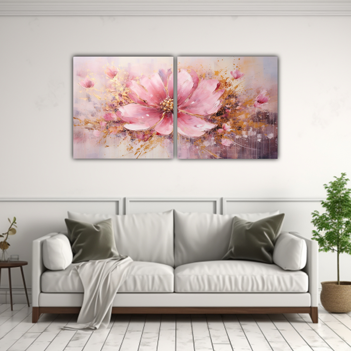 DecoCuadros ofrece cuadros decorativos impresos en tela de alta calidad con bastidores de madera Descubre nuestro díptico Cuadro Contraste con una hermosa flor rosa en lienzo, estilo decorativo Disponible en dorado, plateado, gris, beige y lila