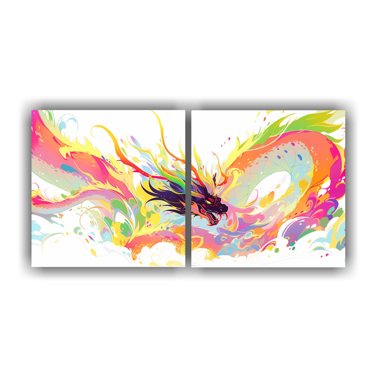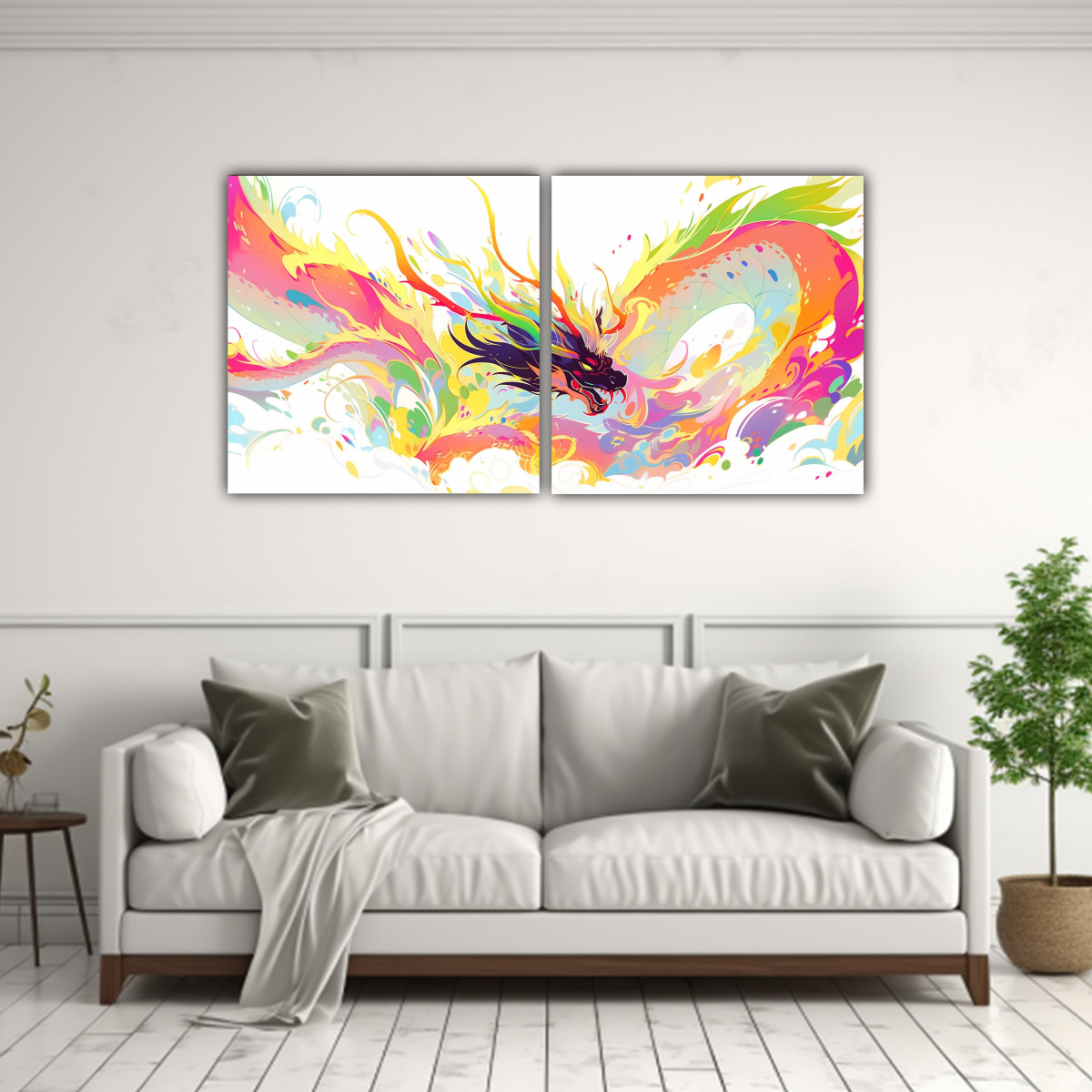 Díptico Cuadro Estética: Dragón En Colores Arcoíris Y Oro Ambiente Neonoir