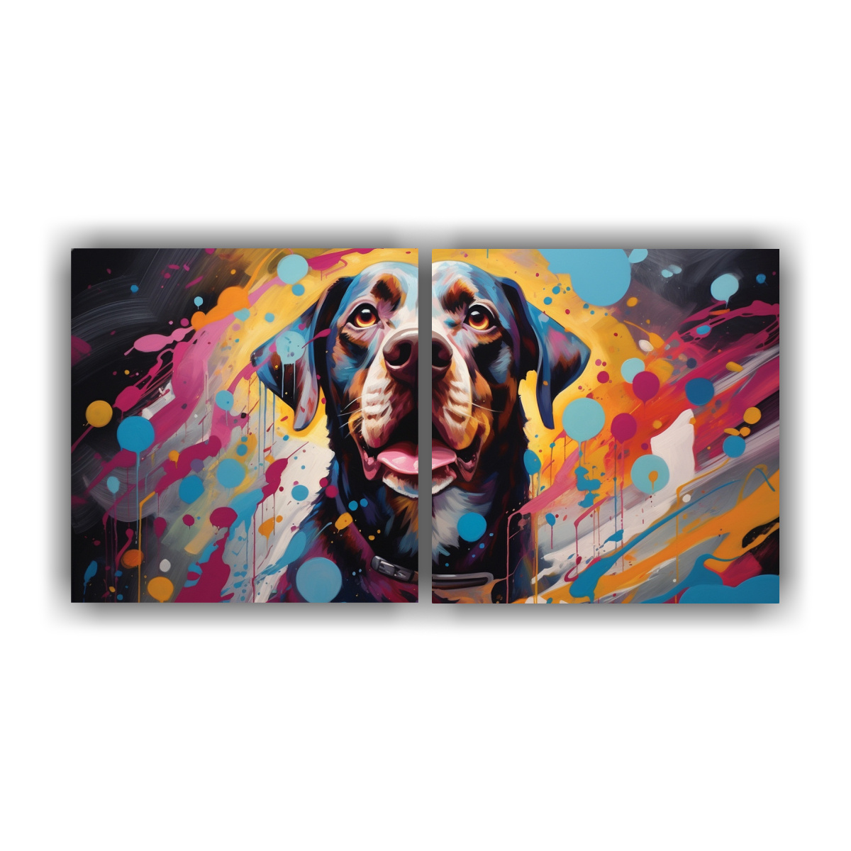 Este hermoso diptico de cuadros abstractos de perros es perfecto para decorar tu sala de estar Colócalo sobre un sofá de color neutro para que los colores vivos del cuadro resalten aún más También puedes combinarlo con cojines en tonos coral, turquesa y menta para lograr una armonía en la decoración ¡Impresiona a tus invitados con este diseño exclusivo de DecoCuadros!