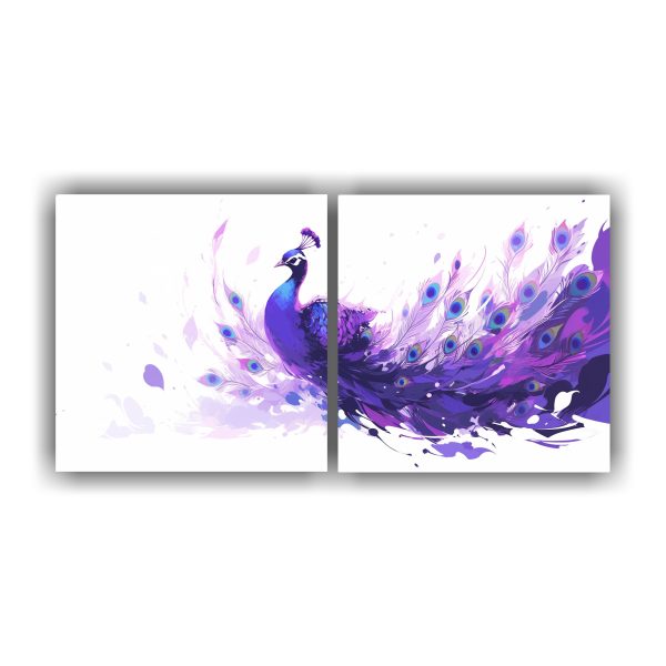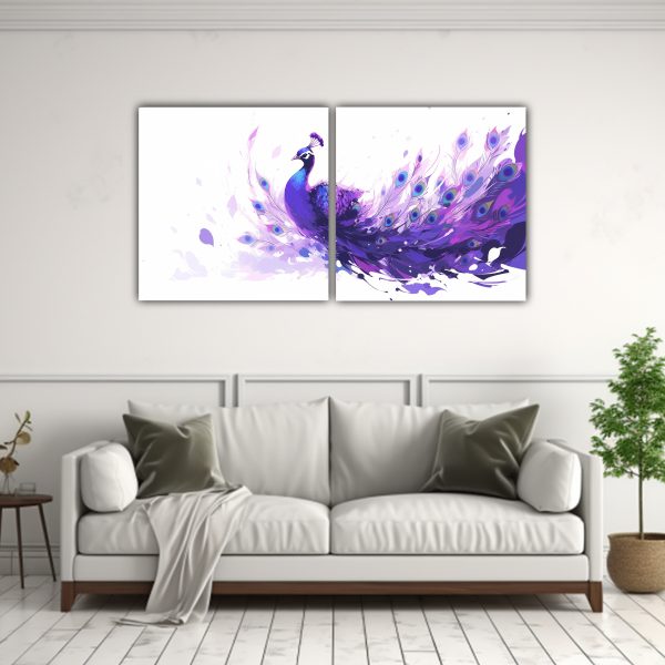 Coloca el cuadro Díptico Horizontal Pavo Real Morado sobre una pared blanca para resaltar sus colores y crear un punto focal en la habitación Combínalo con cojines en tonos lila y turquesa para lograr una decoración armoniosa y moderna