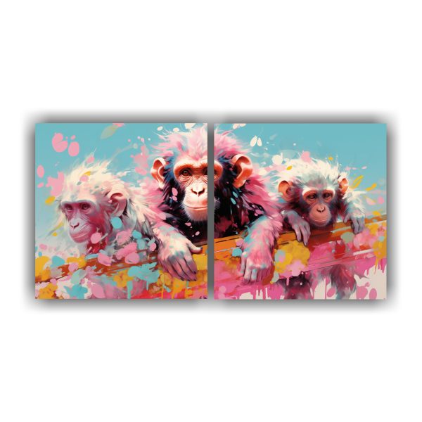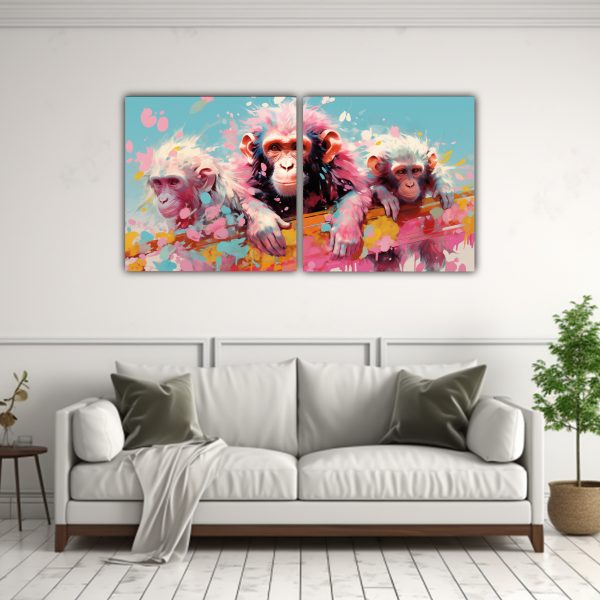 Díptico Impreso Estético De Simios Y Monos En Colores Pastel Y Peonía Neo Pop