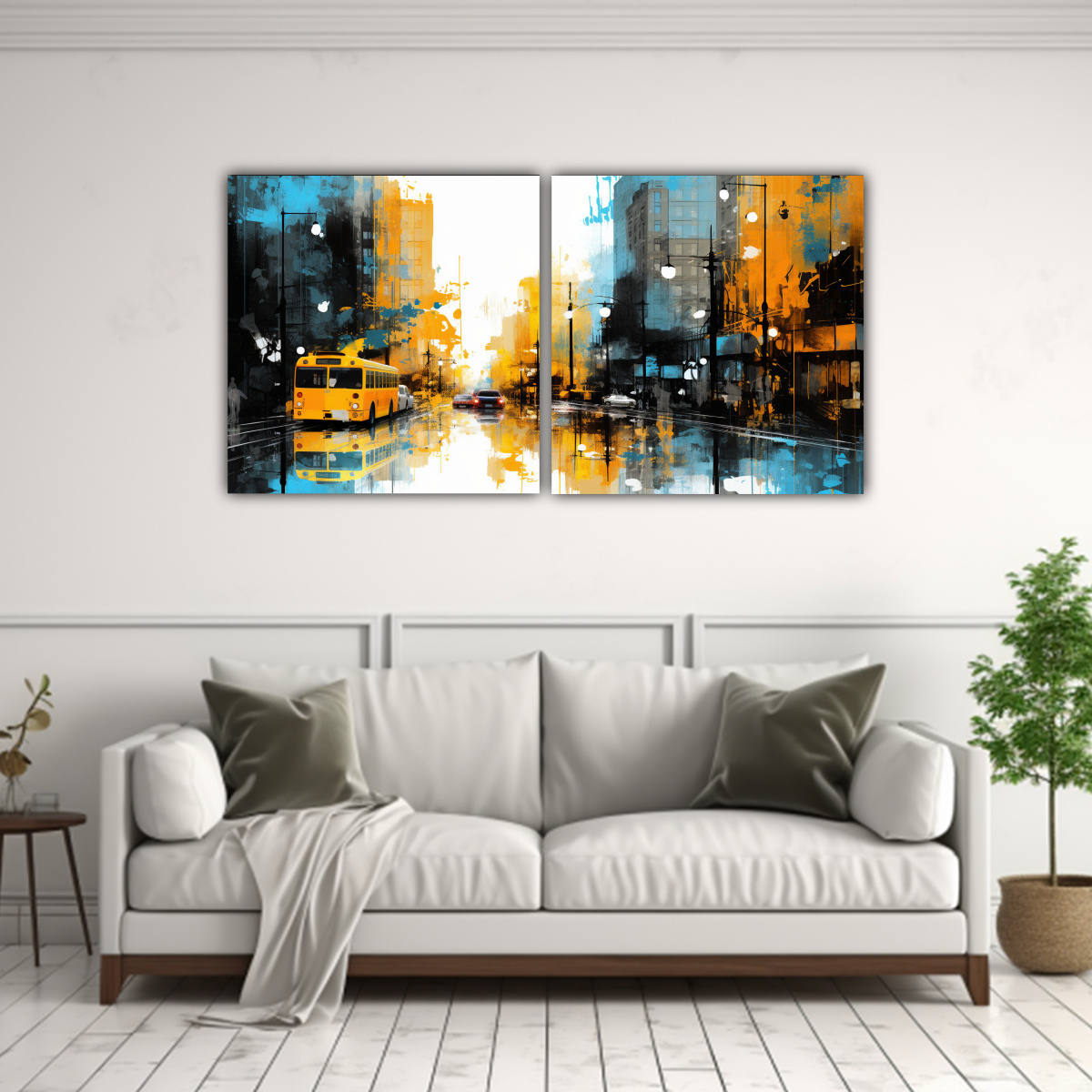 Para resaltar la belleza del Díptico Inspirador Estilo Santiago en Amarillo y Turquesa, te recomiendo colocarlo en la sala de estar sobre un sofá de color neutro Combínalo con cojines en tonos Beige, Carmesí y Menta para lograr un ambiente armonioso y sofisticado