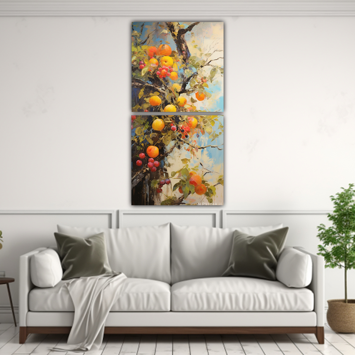 Este Díptico Intenso Surrealista Árboles Frutales es perfecto para darle un toque moderno y vanguardista a tu sala de estar Colócalo sobre un sofá en tonos neutros como gris o chocolate para resaltar su elegancia y combinarlo con cojines en tonos mostaza o coral para darle un toque de color ¡Sorprende a tus invitados con esta obra de arte única!