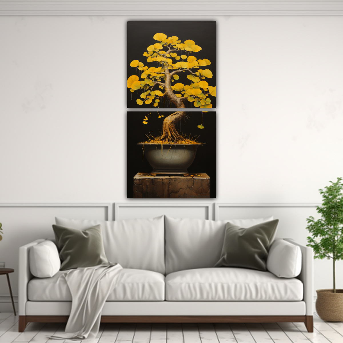 Recomendamos colocar este hermoso díptico en la sala de estar o en un espacio de relajación, combinándolo con tonos neutros y elementos naturales como plantas y maderas El contraste de colores vibrantes y la delicadeza de los detalles del árbol de Ginkgo Biloba en bonsái proporcionarán un toque de elegancia y originalidad a tu ambiente