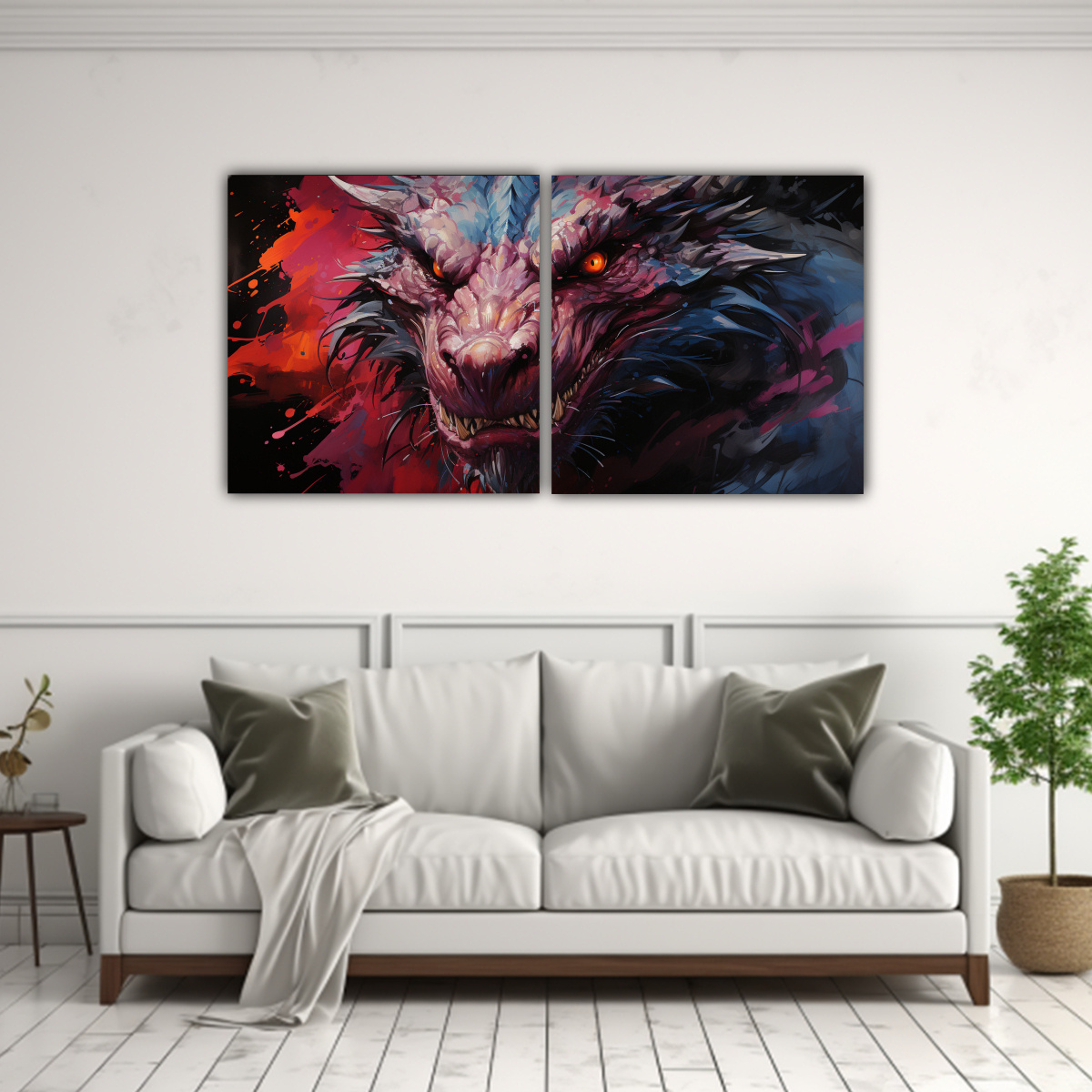 Este díptico con dragón en colores vibrantes y rojos es ideal para destacar en la pared principal de tu sala de estar Combínalo con muebles en tonos neutros o oscuros para crear un contraste impactante y sofisticado