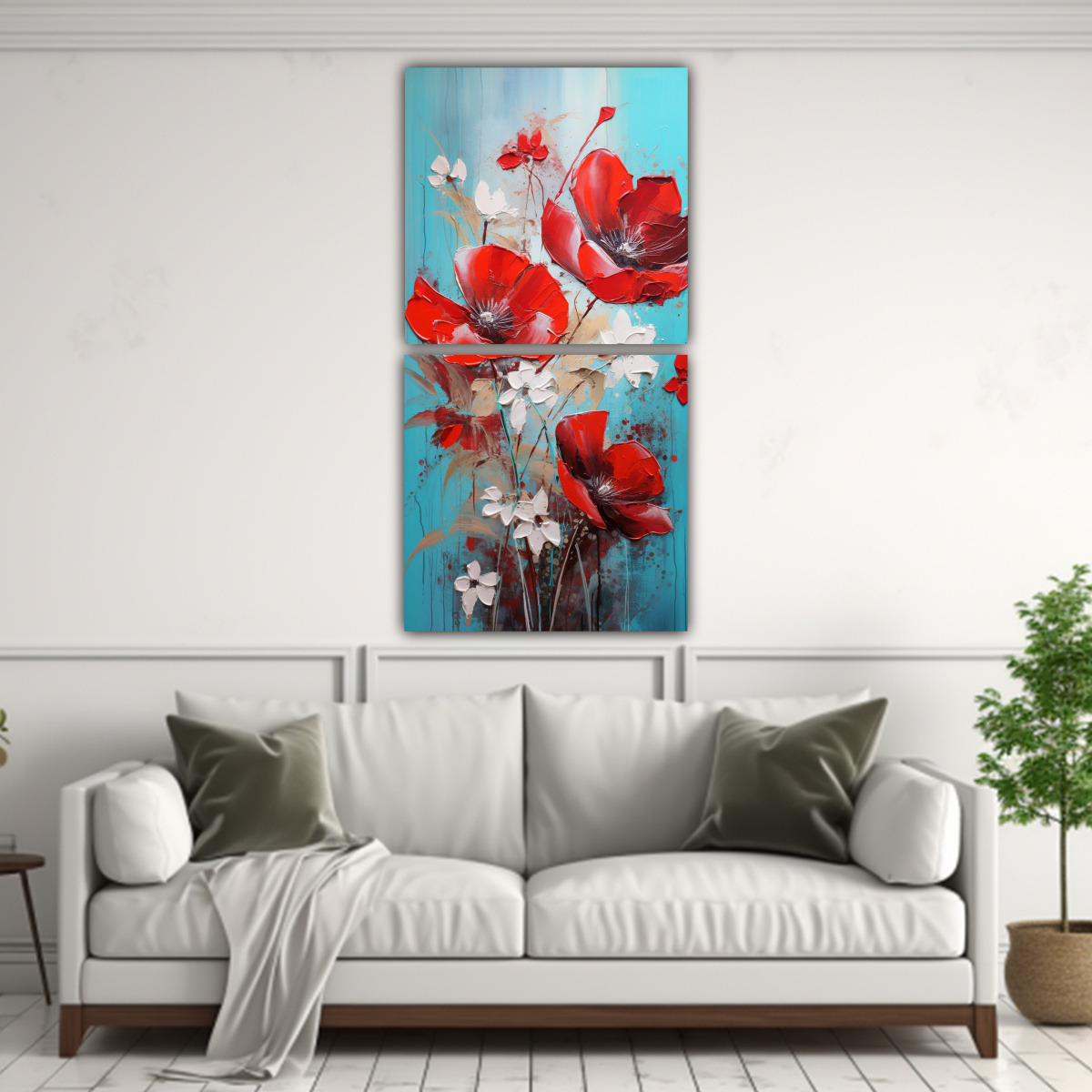 Díptico Tema Fantasia En Rojo Y Turquesa: Pintura De Flores En Lienzo Para Decoración