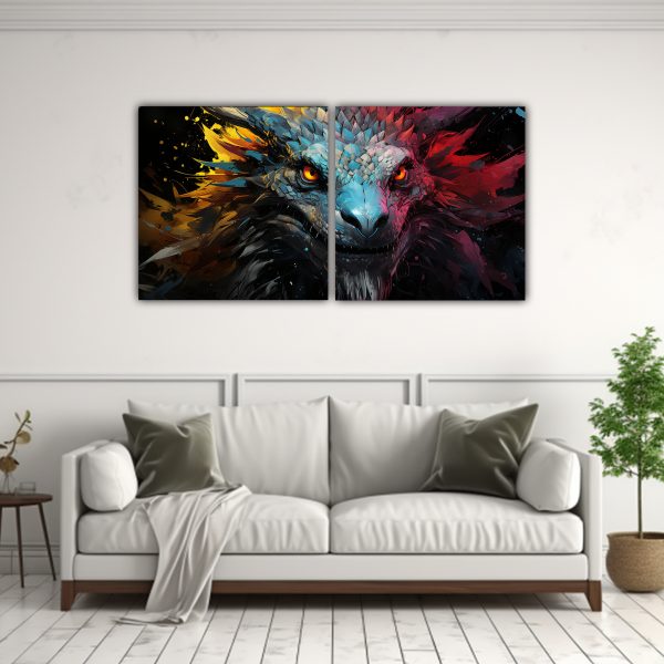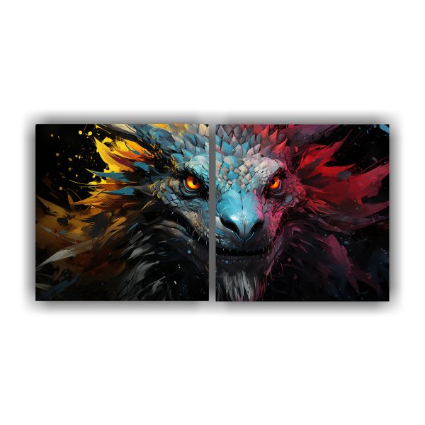 Este díptico Armonía cromática Dragón es perfecto para decorar un espacio moderno o minimalista Colócalo en la sala de estar sobre un sofá en tonos neutros para resaltar su vibrante paleta de colores ¡Agregará un toque de misterio y elegancia a tu hogar!