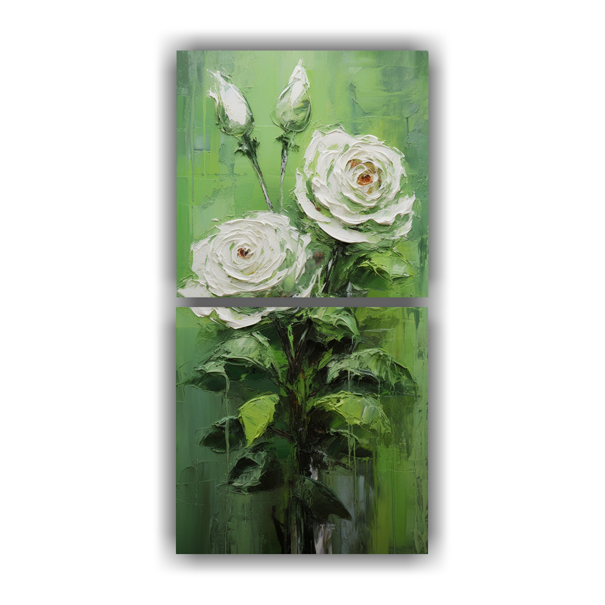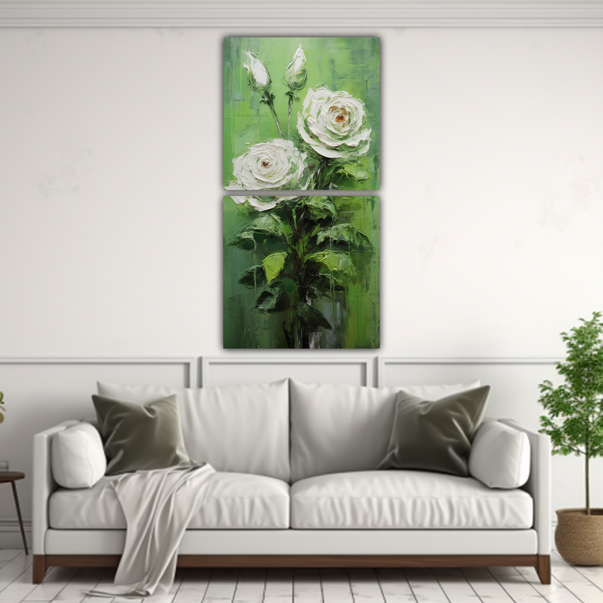 Este cuadro de belleza a Green Roses en lienzo estilo Dos Artes de Pared es perfecto para decorar una sala de estar elegante o un dormitorio refinado Combina perfectamente con muebles de colores neutros como gris o blanco, y agrega un toque de sofisticación y calidez al ambiente Colócalo sobre un sofá o cama para crear un punto focal impresionante en la habitación