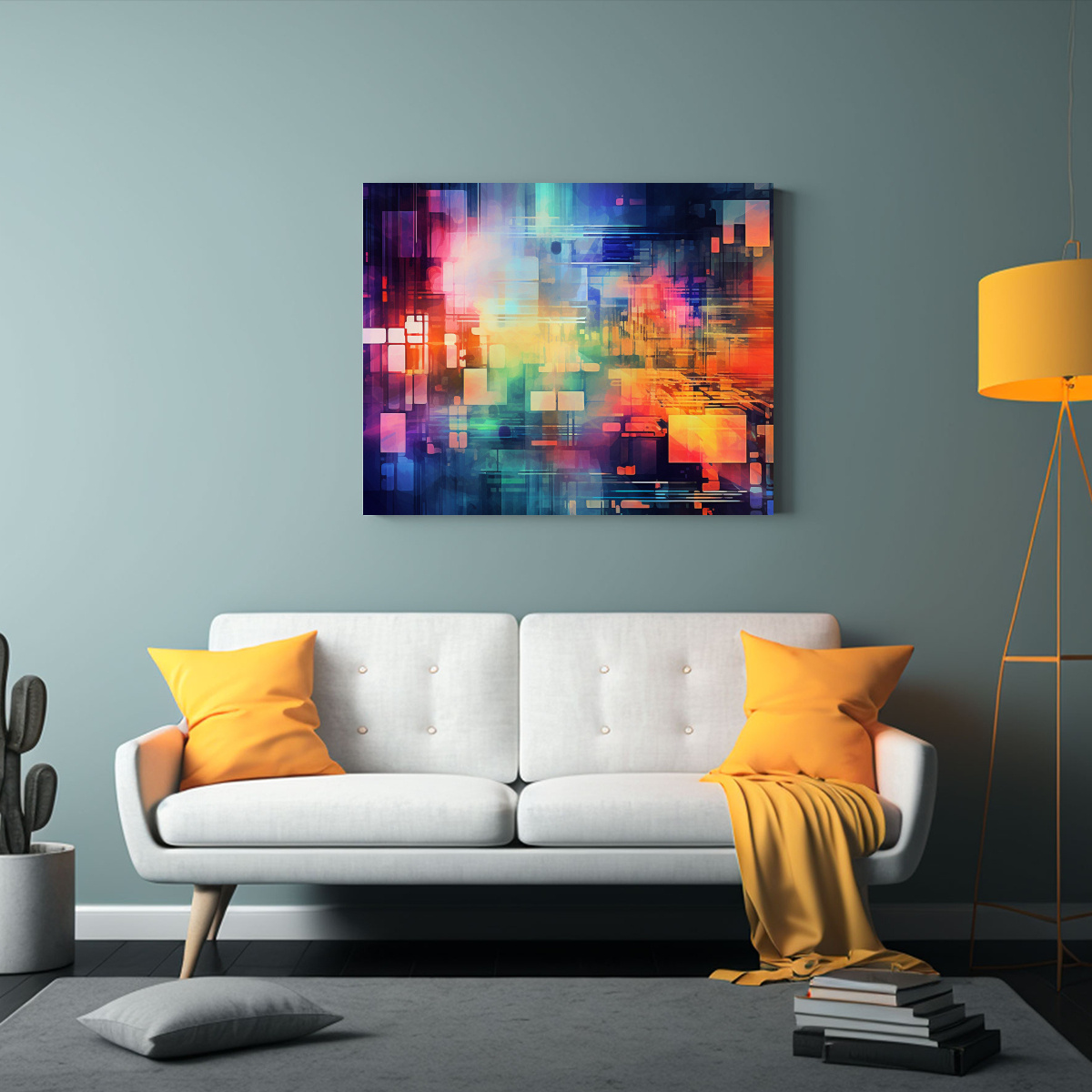 Este cuadro abstracto hi-tech se vería perfecto en la sala de estar, sobre un sofá de color neutro para resaltar sus tonos vibrantes Complementa la decoración con cojines en tonos plateados y turquesa, creando un ambiente moderno y elegante ¡Atrévete a experimentar con la tecnología en la decoración de tu hogar!