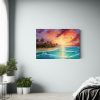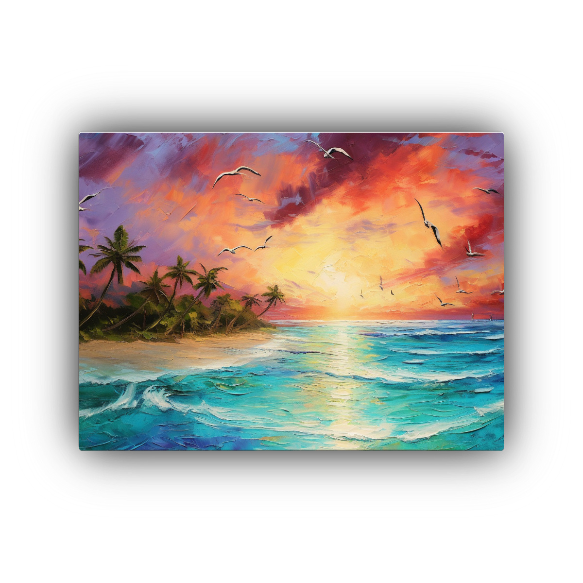 Para realzar la belleza del cuadro ‘Diseño intrincado de lienzo con arcoíris vibrante en el cielo tropical’, te recomiendo colocarlo en una pared blanca para que los colores resalten y creen un ambiente tropical y relajante Combínalo con muebles de madera clara para un efecto armonioso