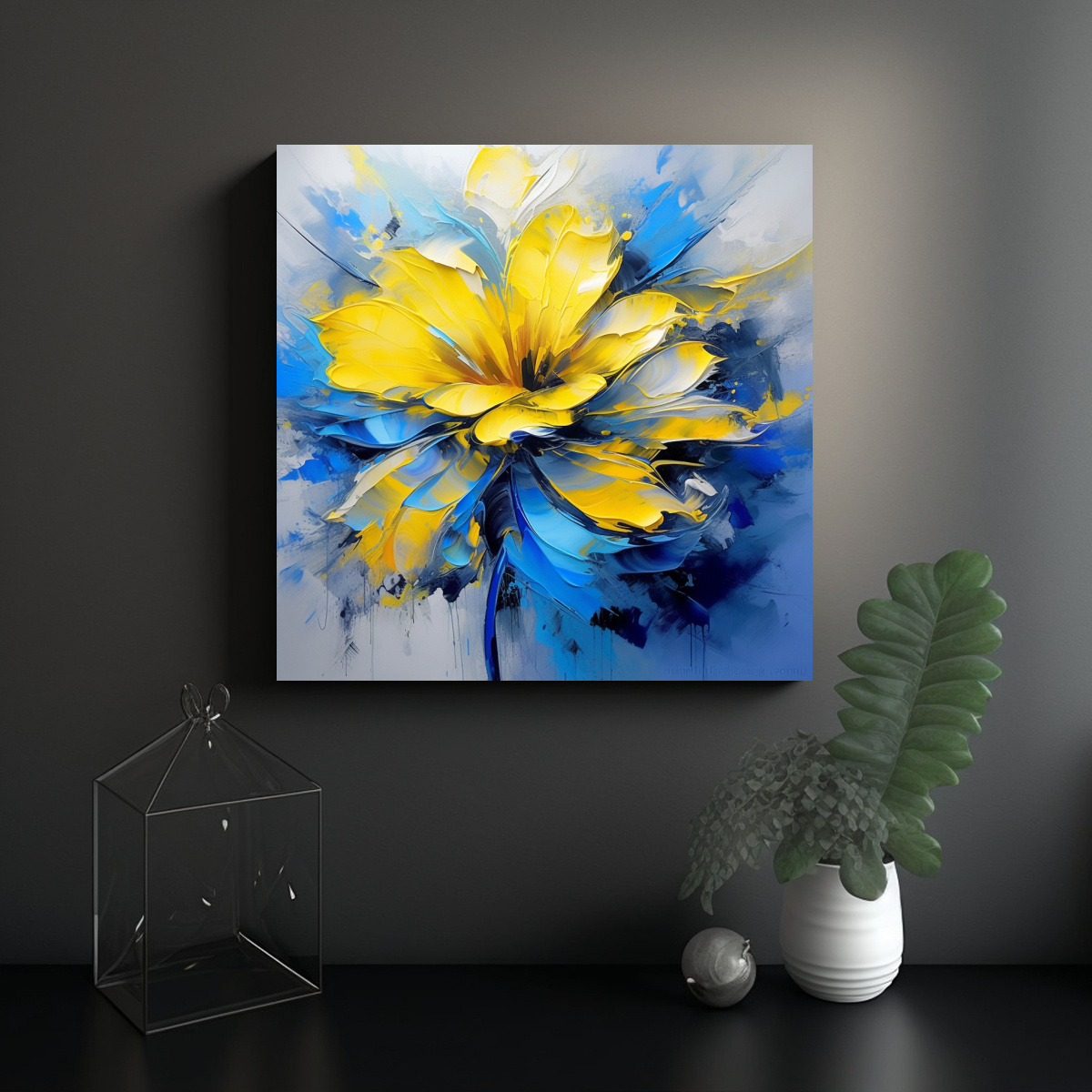 Este cuadro floral amarillo y azul se vería espectacular en tu sala de estar, creando un ambiente acogedor y sofisticado Combínalo con muebles en tonos neutros para resaltar su belleza y llenar tu hogar de armonía y estilo
