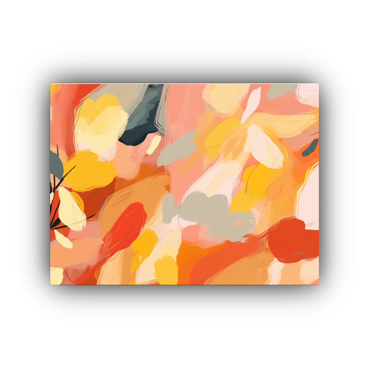 Este cuadro se vería espectacular en el salón principal de tu casa, sobre un sofá gris claro y acompañado de cojines en tonos rosados y dorados Complementa la decoración con una alfombra beige y detalles en amarillo para lograr un ambiente armonioso y sofisticado