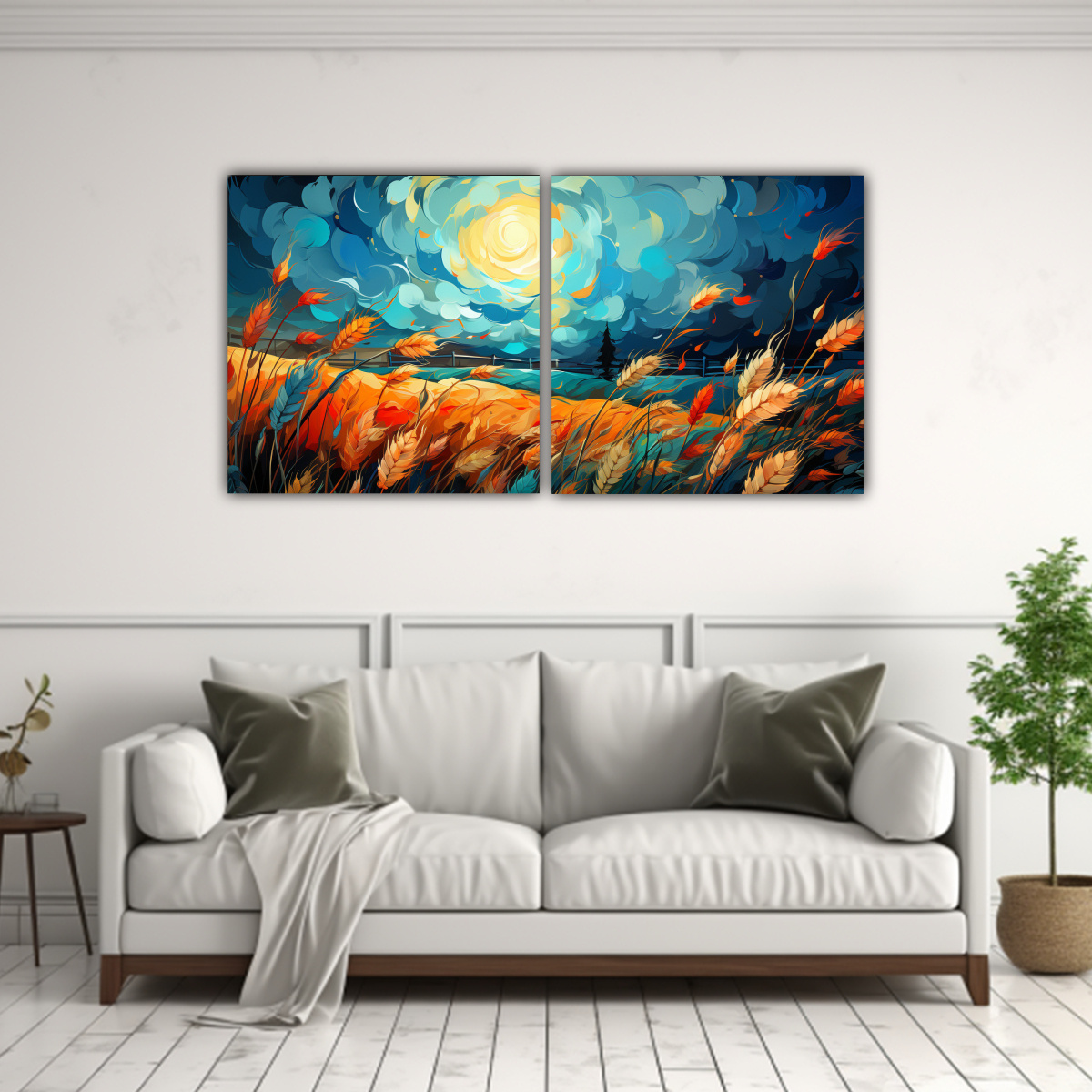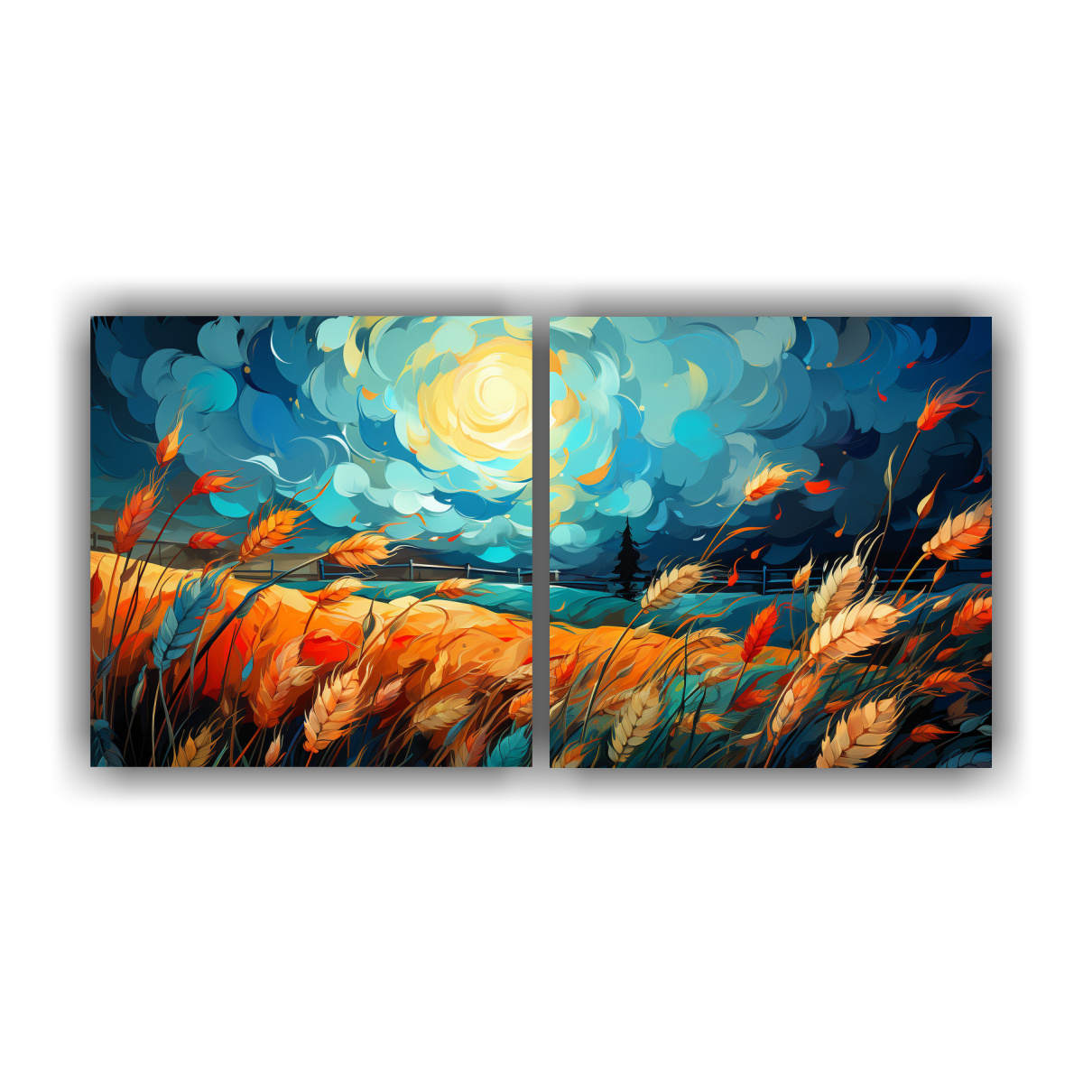 Dos Cuadroes Juveniles De Granos De Trigo En Colores Naranja Y Azul Con Atmósfera Neonoir