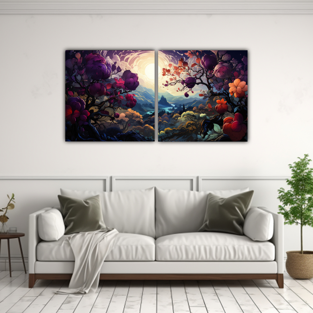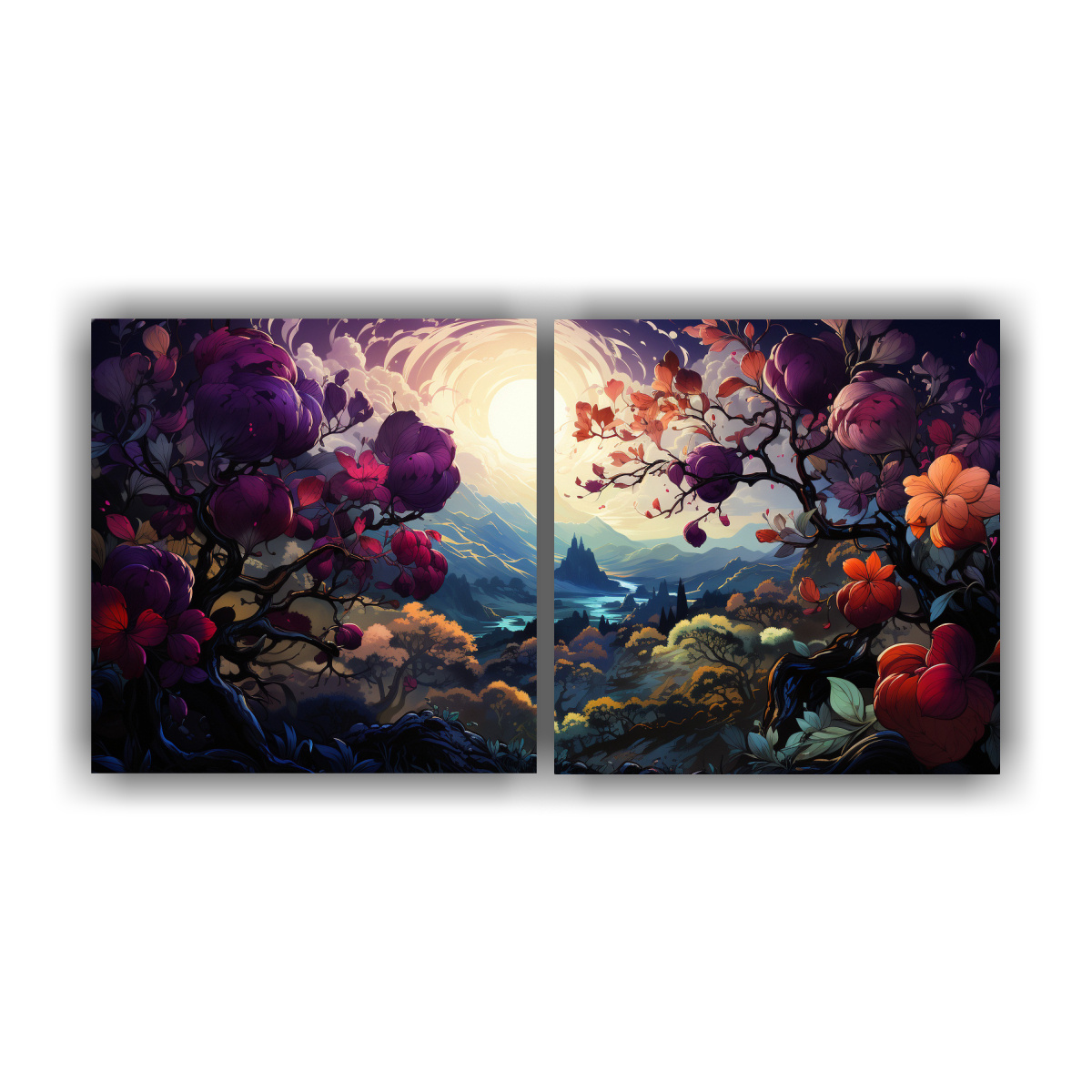Dos Cuadros Colores Dormitorio: Un Manzano En Verde Y Púrpura Con Atmósfera Neonoir