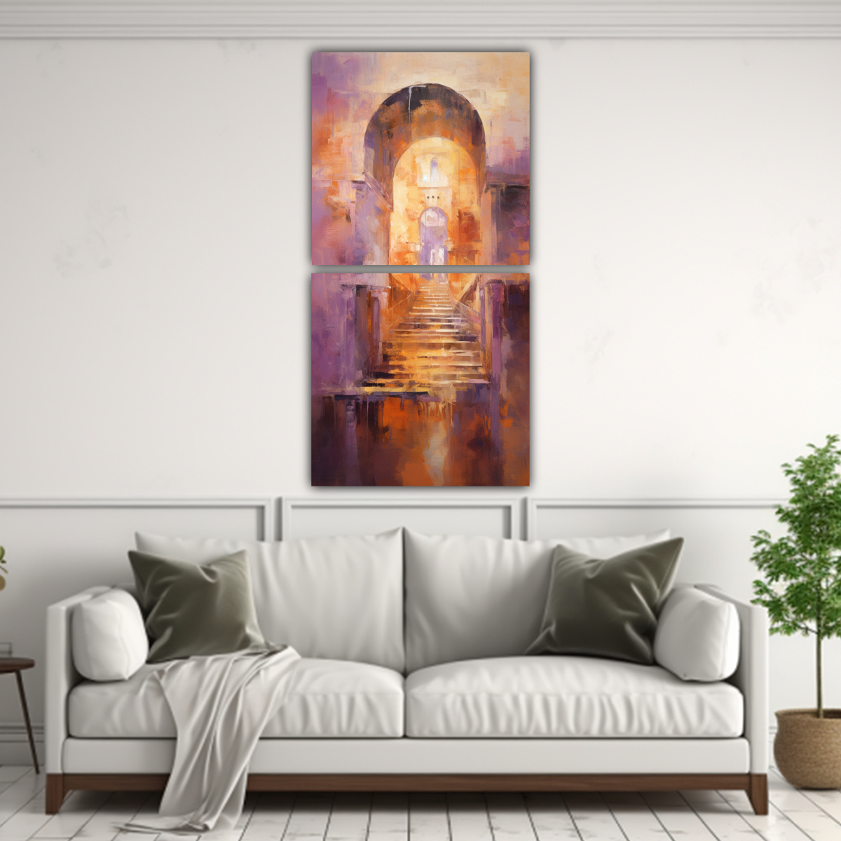 Este cuadro de minimalismo con tonos púrpuras y dorados brillantes sería perfecto para decorar un salón moderno Colócalo sobre un sofá gris oscuro para resaltar los colores y añade cojines y accesorios en tonos coral y chocolate para crear un ambiente acogedor y sofisticado