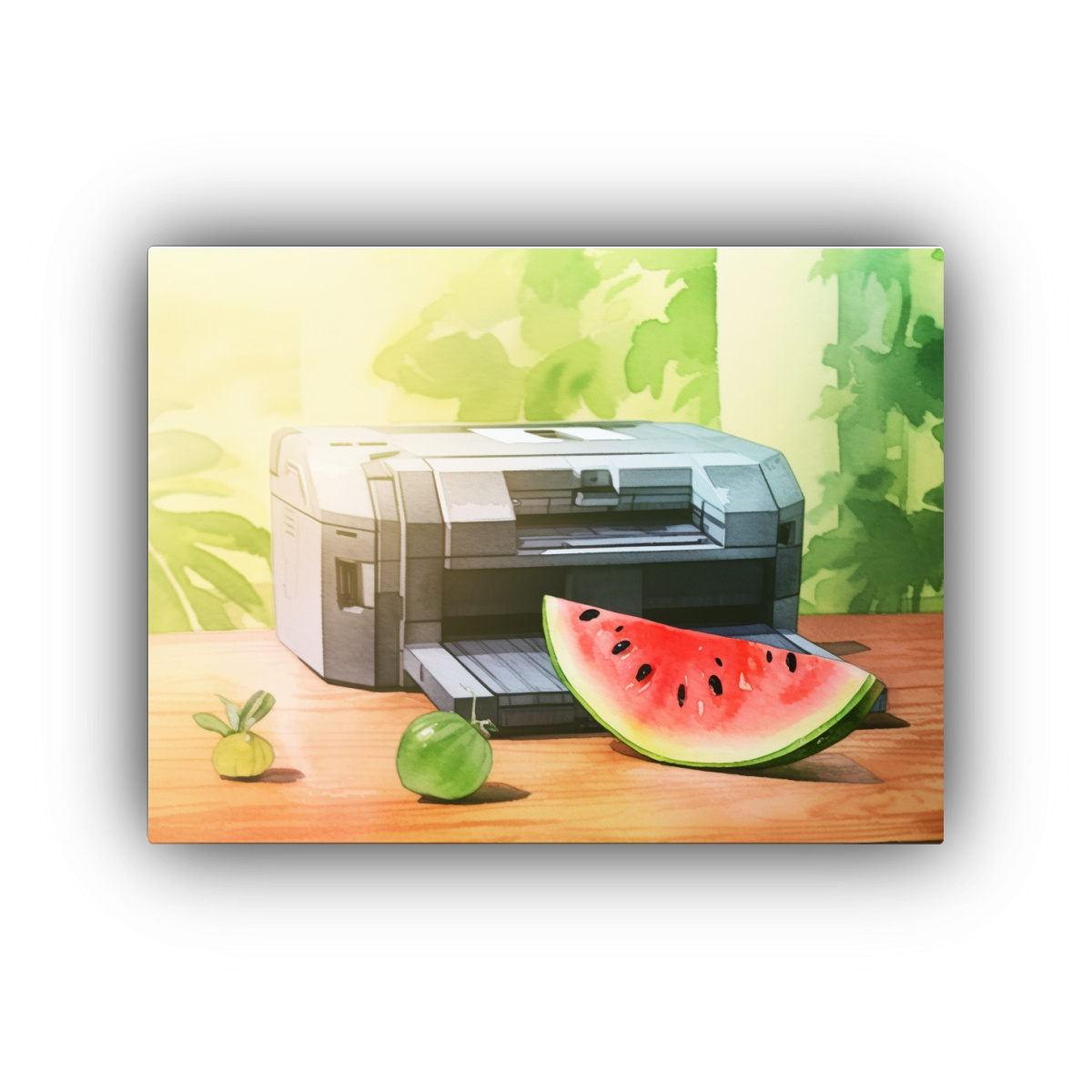 Dos Impresoras Sobre Mesa De Madera Clara, Papel Y Tela Canvas: Arte Luminoso.