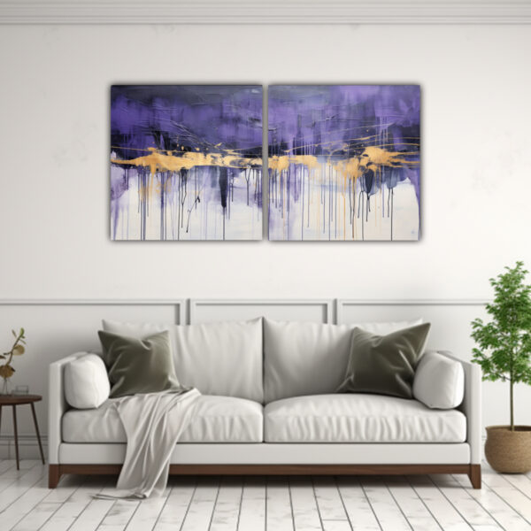 Los dos lienzos abstracto armonía cromática de Kimberley Waleskis en azul, morado, oro y negro son la elección perfecta para decorar tus espacios con un toque moderno y sofisticado Con su diseño exclusivo y la mejor calidad del mercado, estos cuadros son la opción ideal para aquellos que buscan hacer una declaración de estilo en su hogar