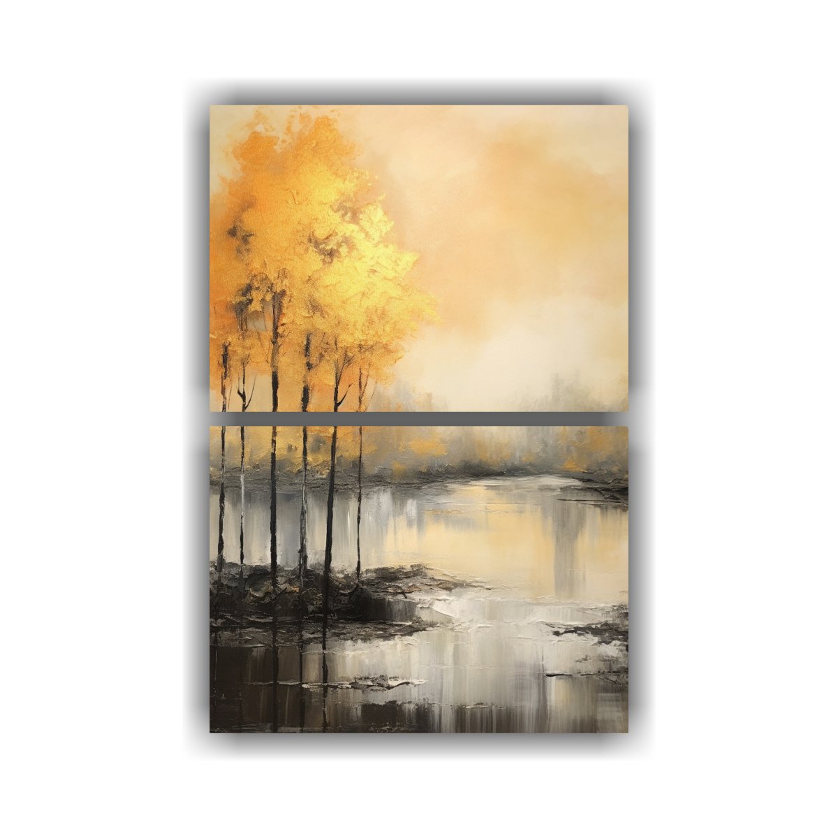 DecoCuadros te ofrece los Dos Lienzos De Tela Espectacular Bastidor de Madera paisaje abstracto con tonos dorados y reflejos de luz, con diseños exclusivos y la mejor calidad del mercado Combina sofisticación y elegancia en tu hogar Entregas rápidas y gratuitas en Santiago