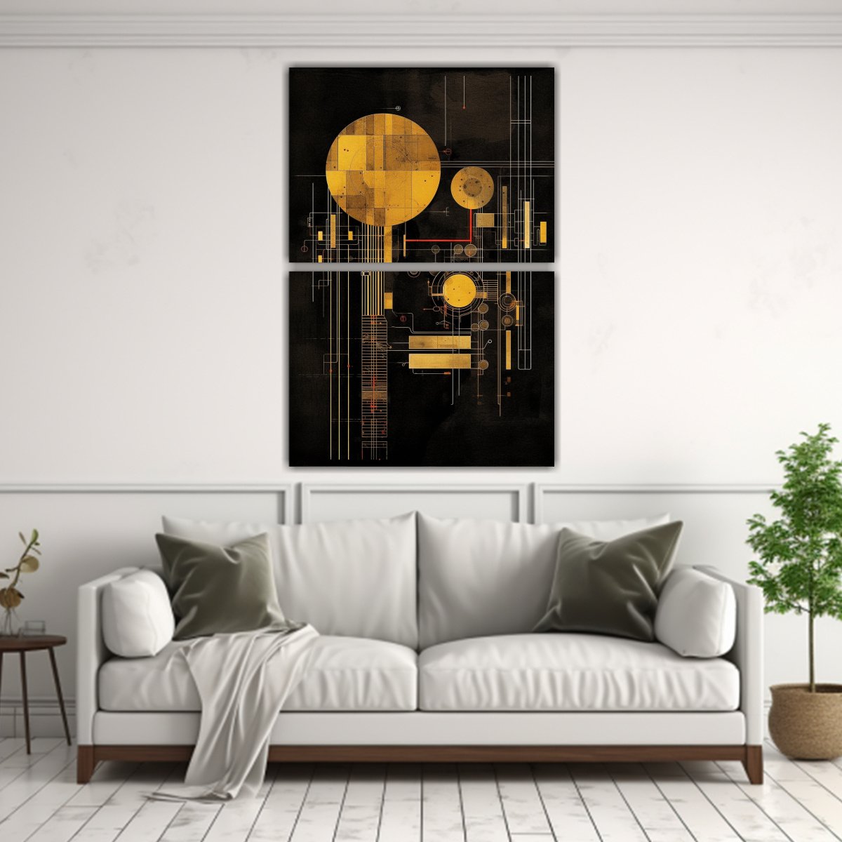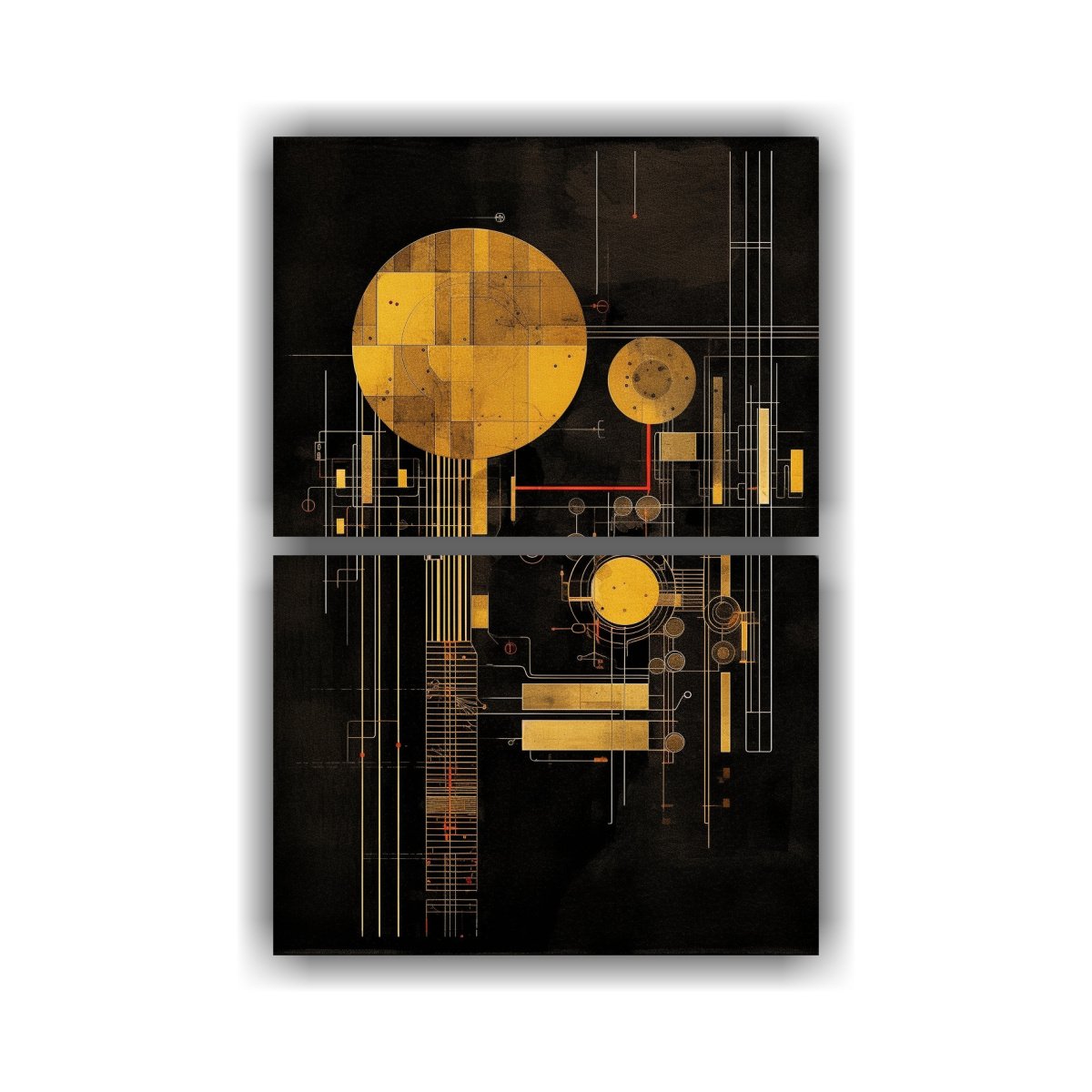 Dos Pinturas Decorativas De Composiciones Inspiradoras En Un Esquema Técnico Circular Dorado Sobre Fondo Negro Texturizado.