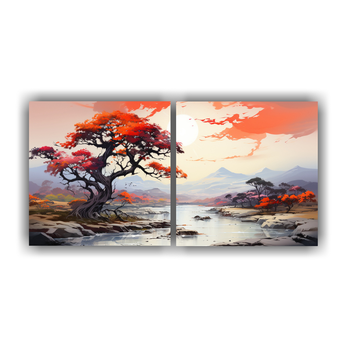 Decora tus espacios con el cuadro abstracto ‘Dos Telas Expresión Calma A Árbol de Acacia Rojo y Naranja’ de DecoCuadros Calidad y precios económicos Envío gratis en Santiago Diseño exclusivo y entrega rápida