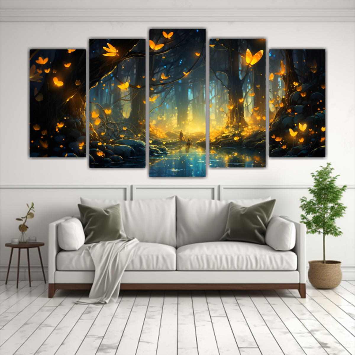 Decora tu hogar con el elegante arte de pared vintage de DecoCuadros Set de 5 cuadros decorativos con el encanto abstracto y resplandor de luciérnagas en un paisaje ¡Compra ahora!