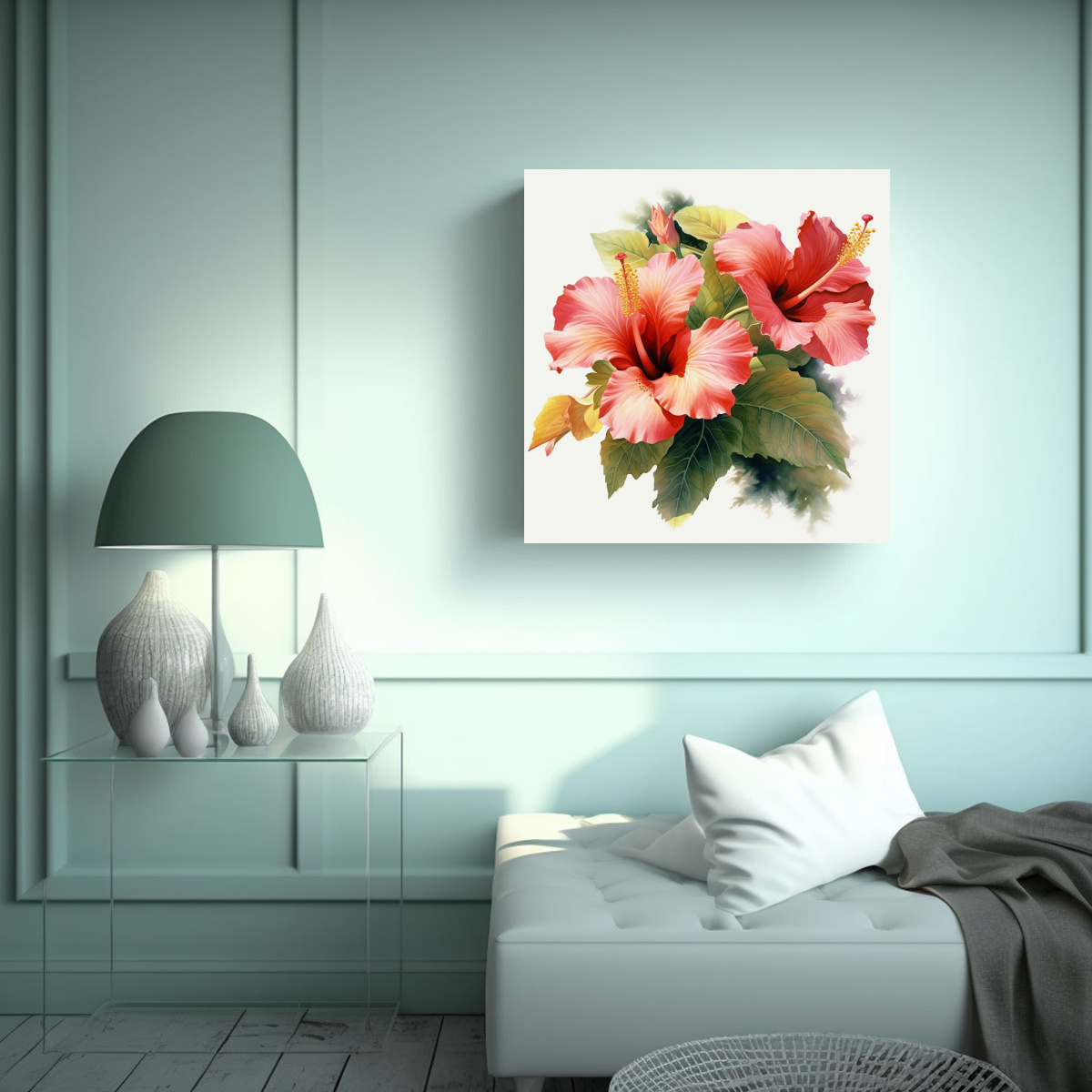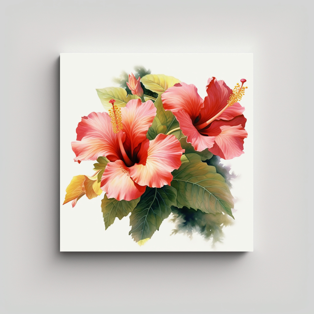 Composición fotográfica minimalista en tela con hibiscus, fondo blanco y estilo acuarela Encuentra el cuadro perfecto para darle vida a tu hogar