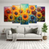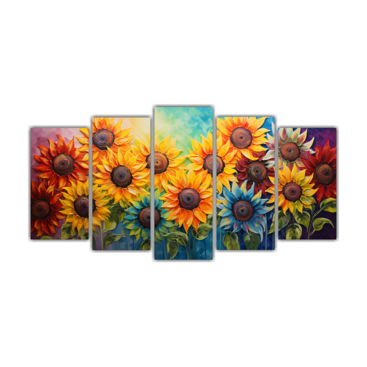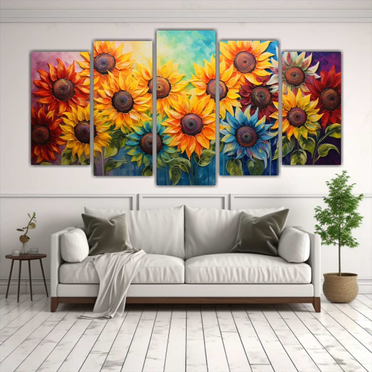 Exposición De Cinco Artes: Pintura De Girasoles En Lienzo En Colores Del Arco Iris