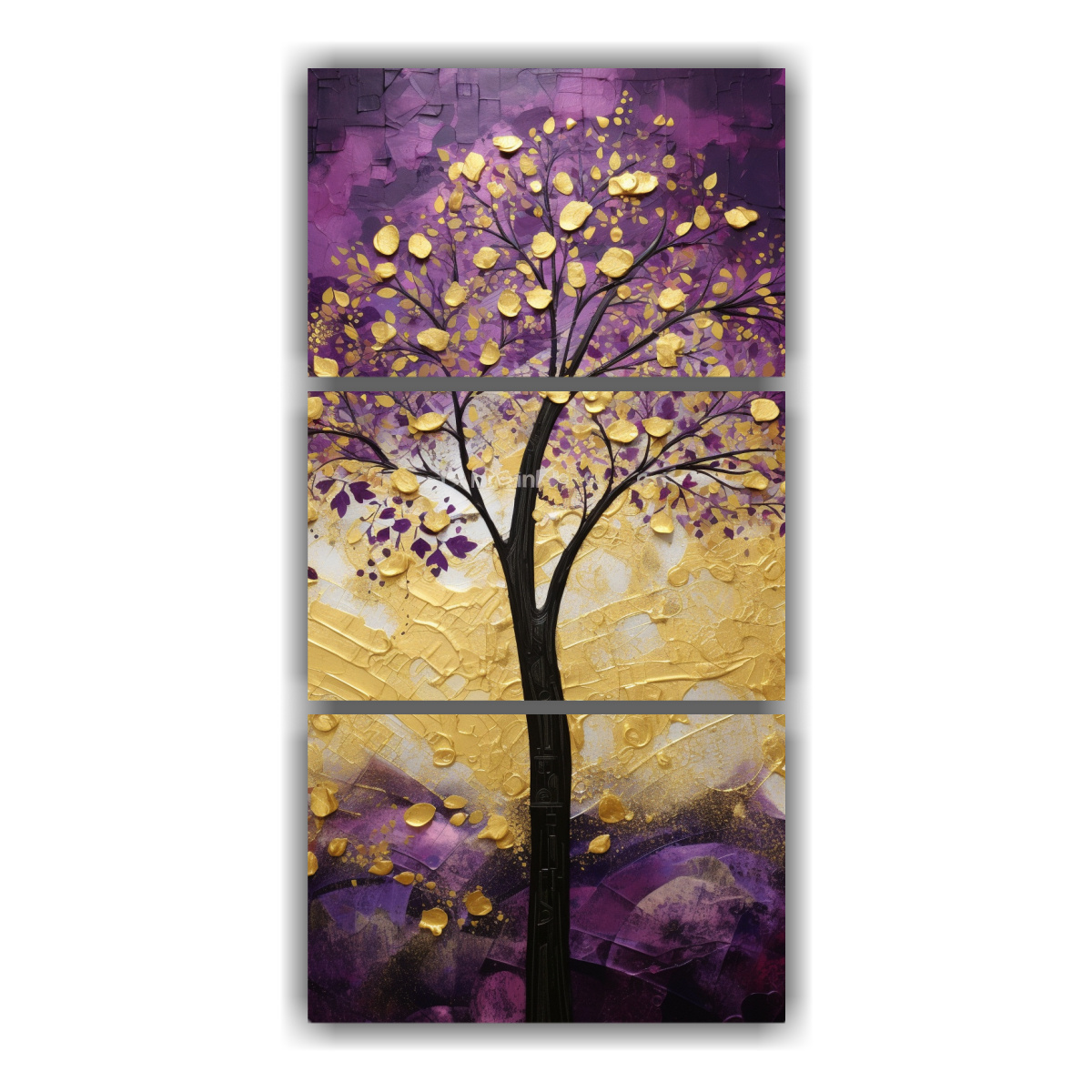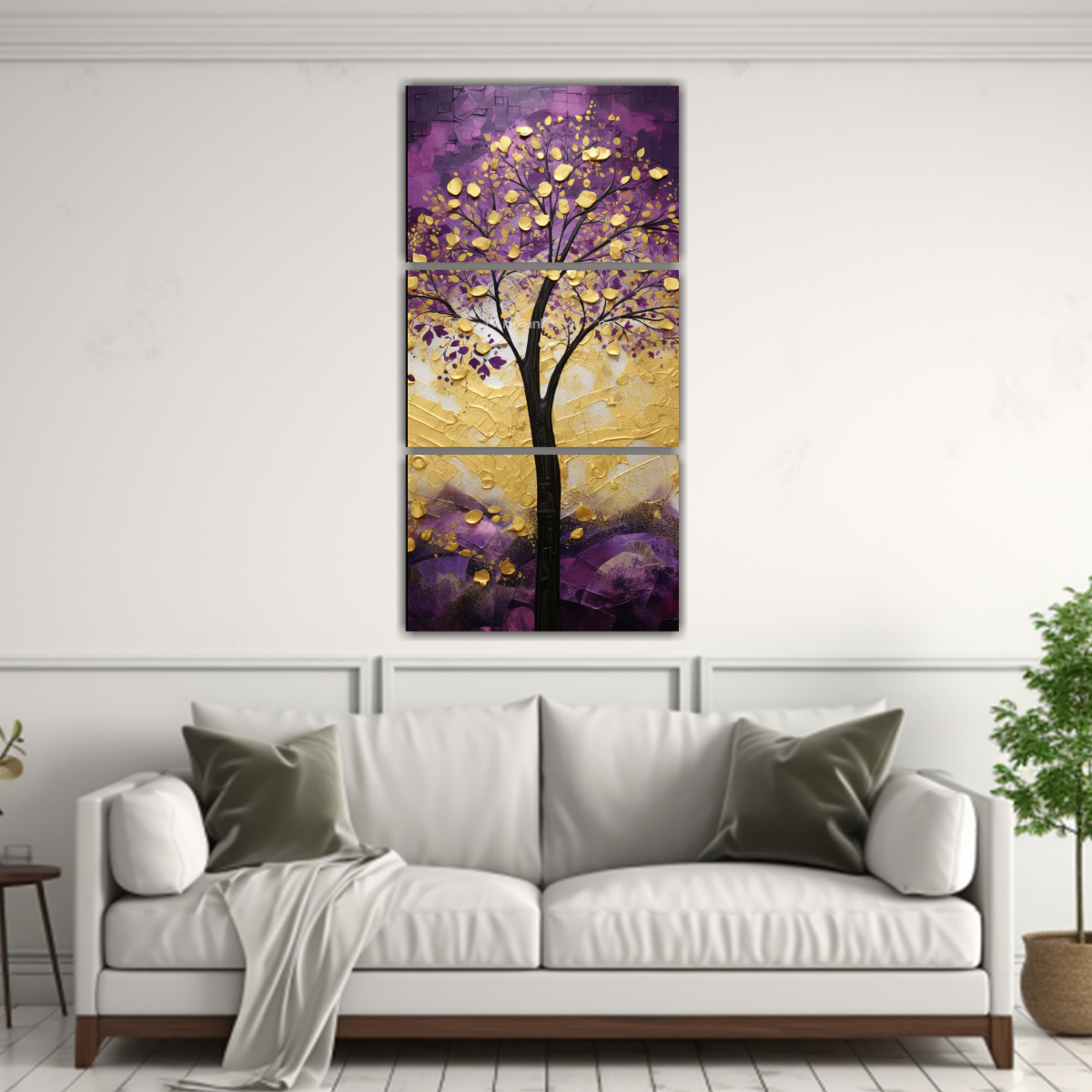 DecoCuadros te presenta una exposición de pinturas decorativas en tonos púrpura y amarillo con imagen del árbol Encuentra los mejores cuadros de alta calidad y al mejor precio