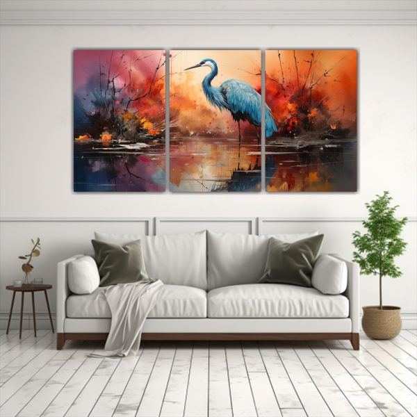 Este cuadro ‘Fantasía de Grullas en Acuarela Colorida’ sería perfecto para colocar en la pared principal de tu sala de estar, creando un punto focal colorido y elegante Combínalo con cojines en tonos coral y verde azulado para un ambiente armonioso