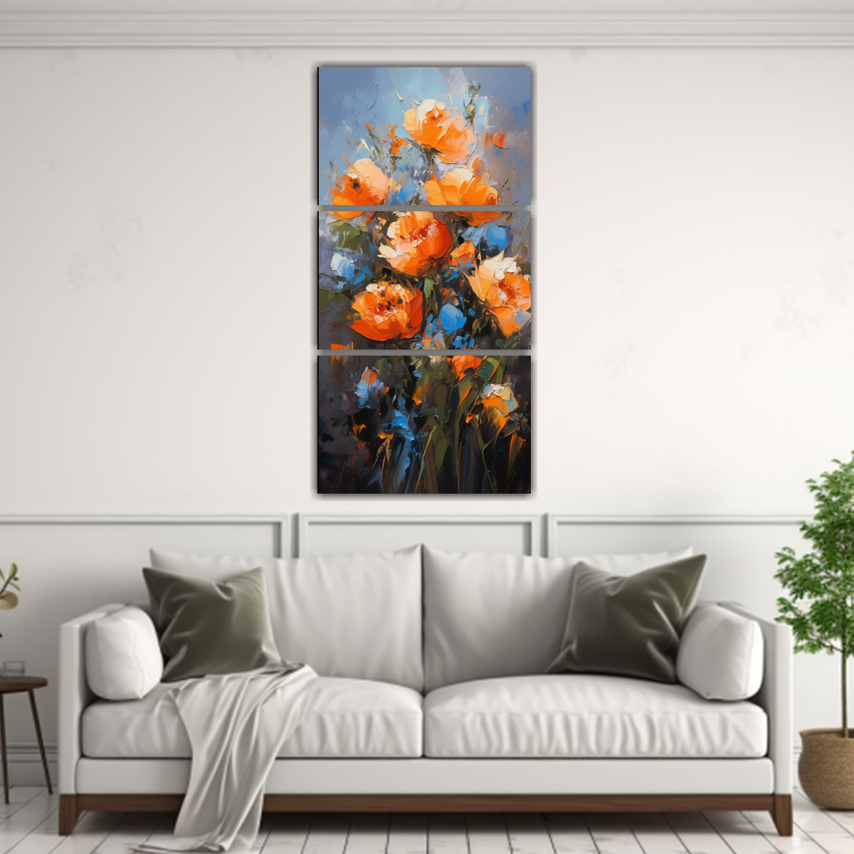 Fantasía Floral: Tríptico En Bastidor De Tres Telas En Naranja Y Azul
