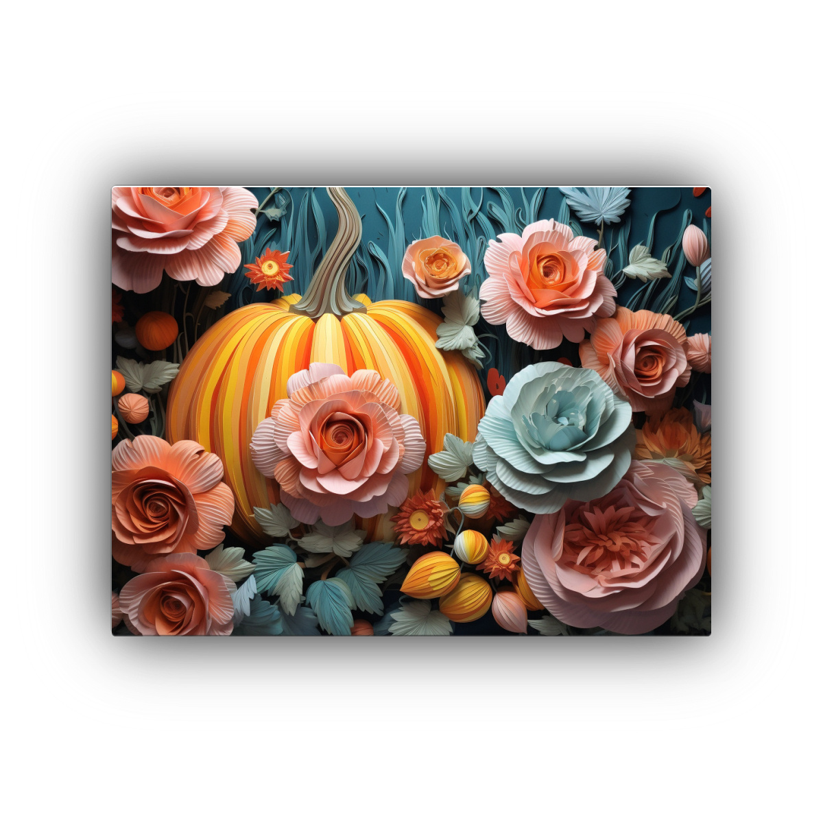 Flores De Papel Y Calabazas Voluminosas: Diseño Refinado En Decoración Con Pinturas Delicadas.