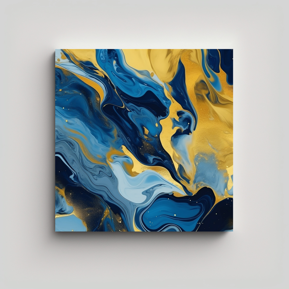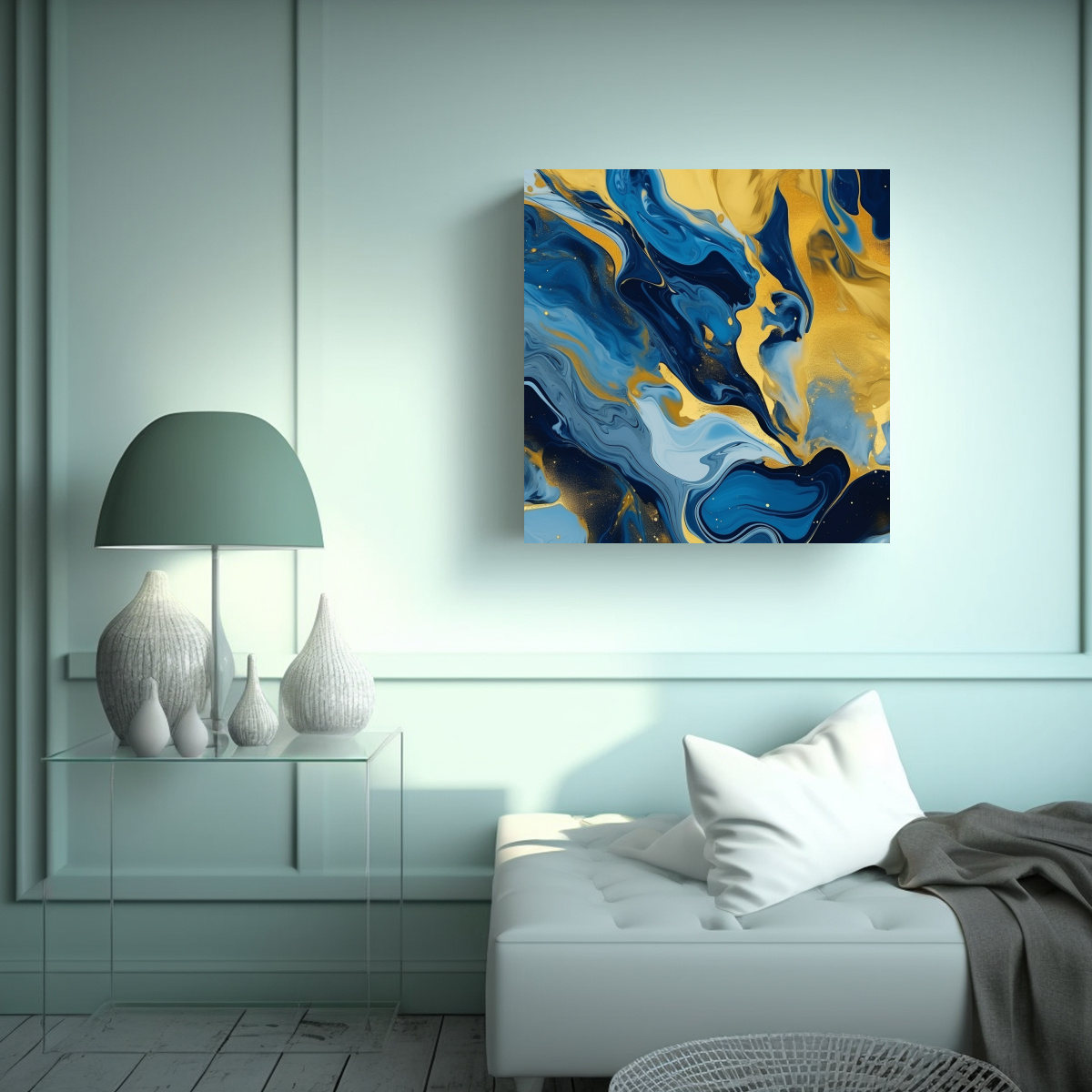 Este cuadro abstracto azul y dorado Canva Tonos Linda de mármol líquido pat puede ser colocado sobre un mueble blanco de estilo minimalista, creando un contraste armonioso y sofisticado Complementa la decoración con cojines y accesorios en tonos coral, verde azulado y turquesa para lograr un ambiente fresco y moderno Atrévete a darle a tu hogar un toque de elegancia con este cuadro exclusivo de DecoCuadros