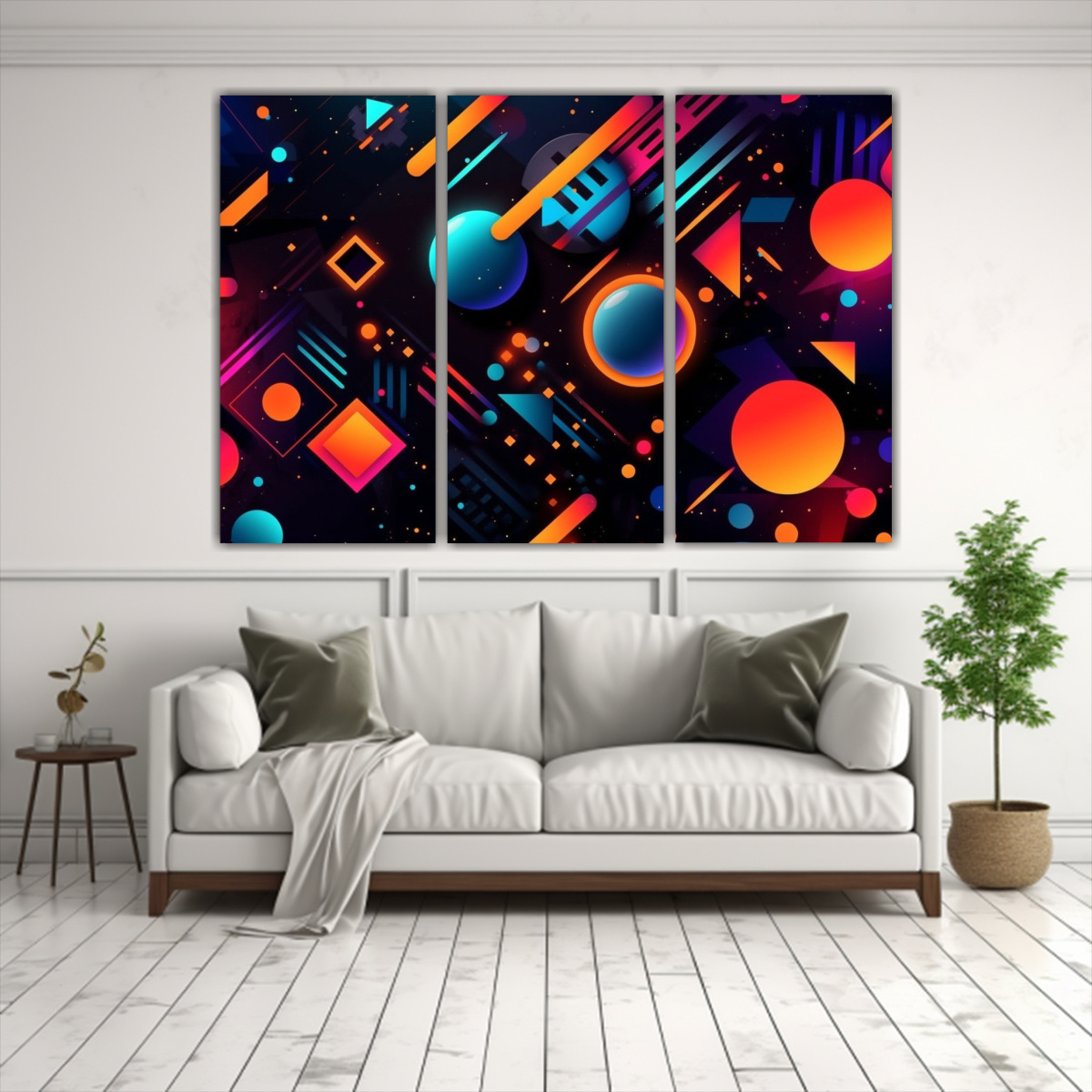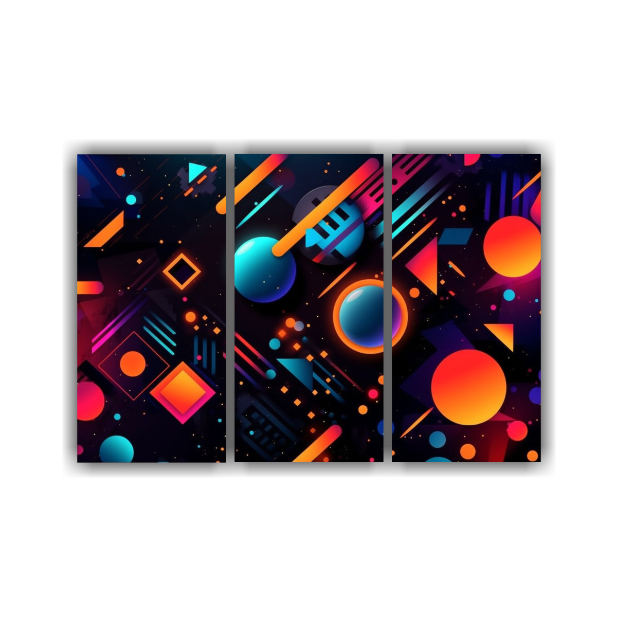 Este cuadro abstracto rectangular horizontal con formas neón se vería perfecto en la sala de estar sobre un sofá de color neutro, creando un contraste vibrante y moderno Combínalo con cojines en tonos turquesa y coral para una decoración elegante y actual