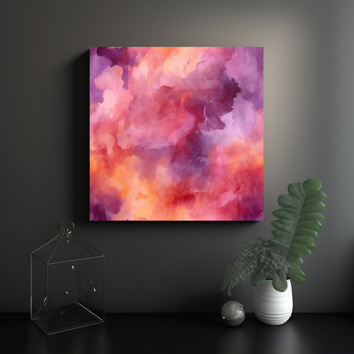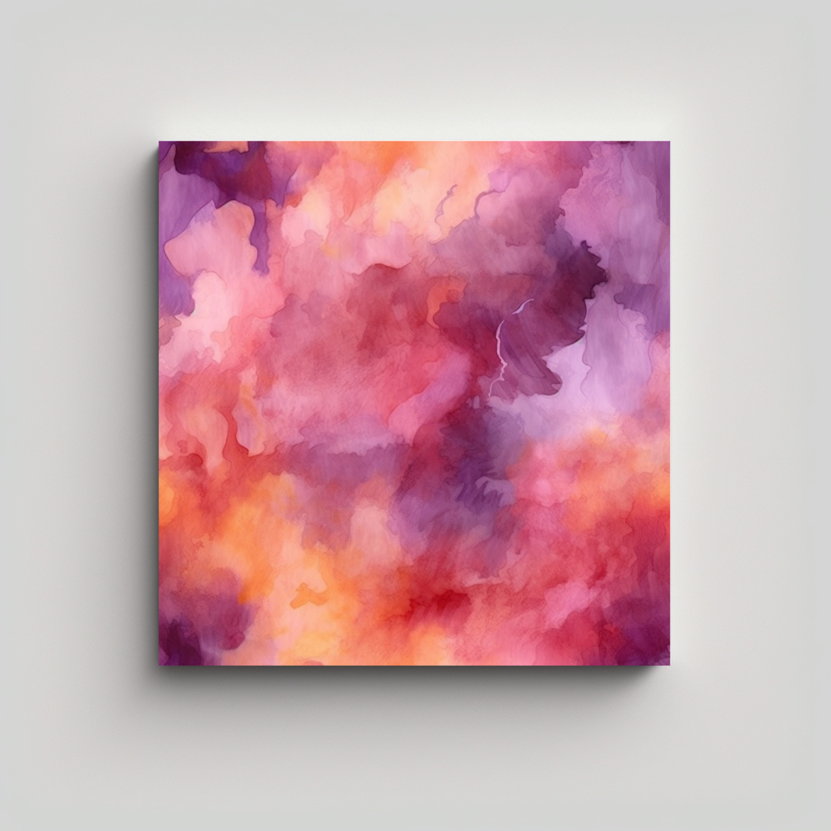 DecoCuadros presenta un cuadro decorativo con fondo acuarela abstracto multicolor y patrón naranja Los colores coral, carmesí, rosado claro, gris y morado se combinan en una obra única Aseguramos la mejor calidad y precios competitivos en el mercado Envíos express a regiones disponibles
