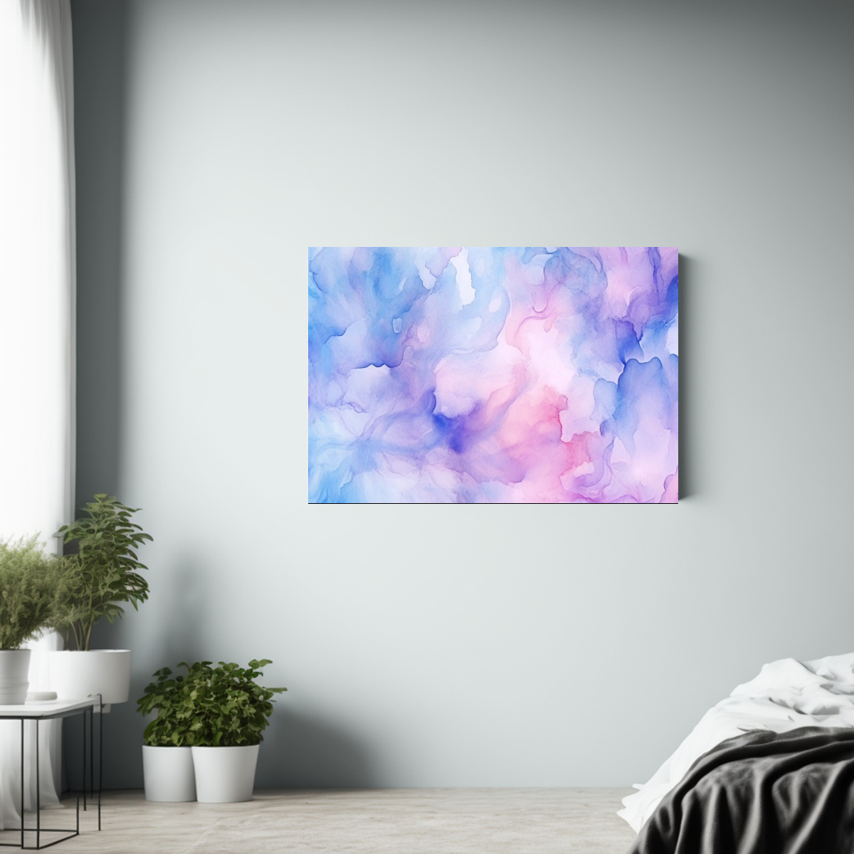 Para lograr un efecto armonioso, combina este cuadro Fondo acuarela azul mini con cojines en tonos turquesa y beige en tu sofá Añade cortinas blancas para potenciar la luminosidad y crear un espacio acogedor y chic ¡Transforma tu sala con un toque de arte!