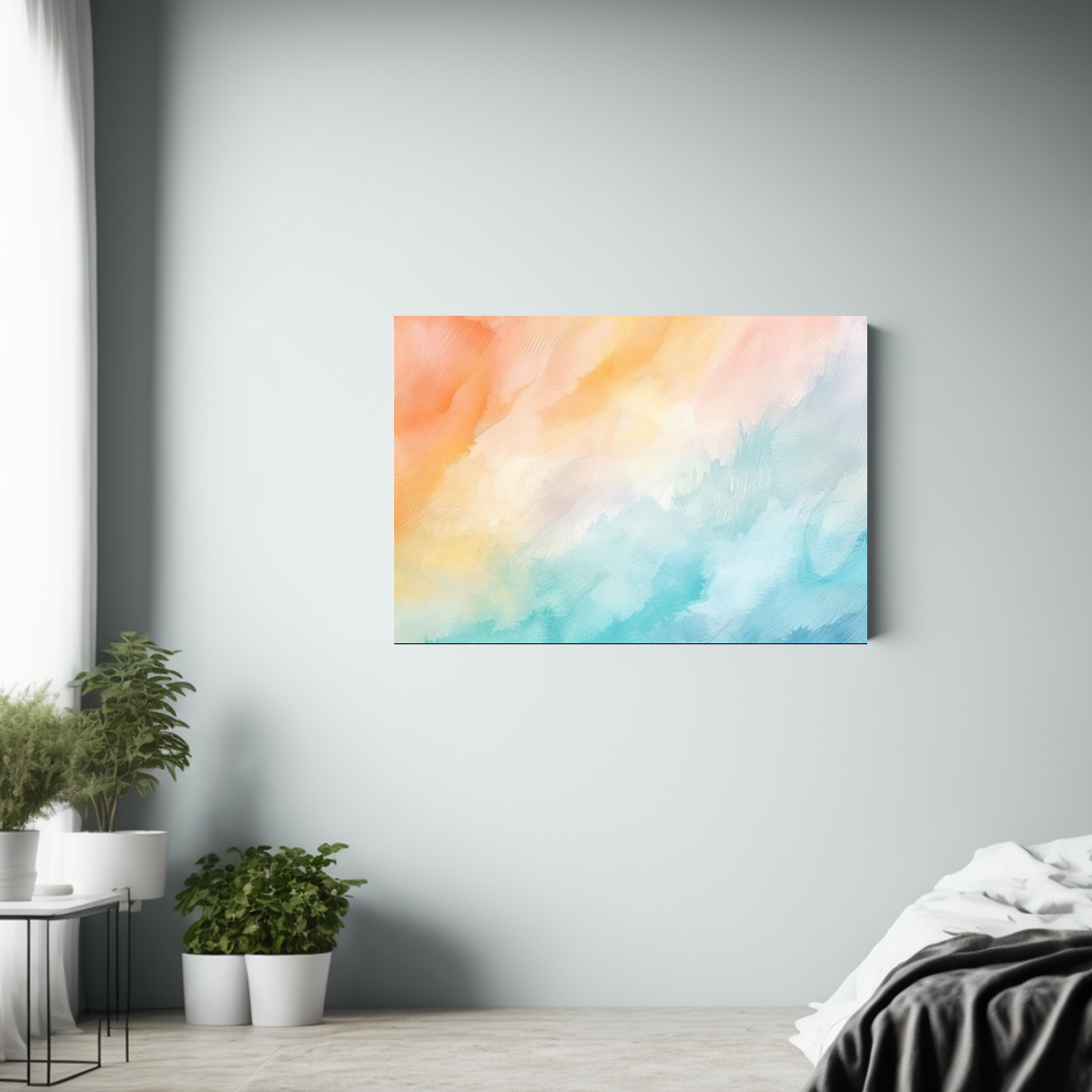 Este hermoso cuadro de estilo acuarela en tonos pastel como Coral, Beige y Turquesa es ideal para decorar salas de estar o dormitorios, aportando un toque de frescura y elegancia Colócalo sobre un mueble blanco o junto a plantas para crear un ambiente relajante y moderno