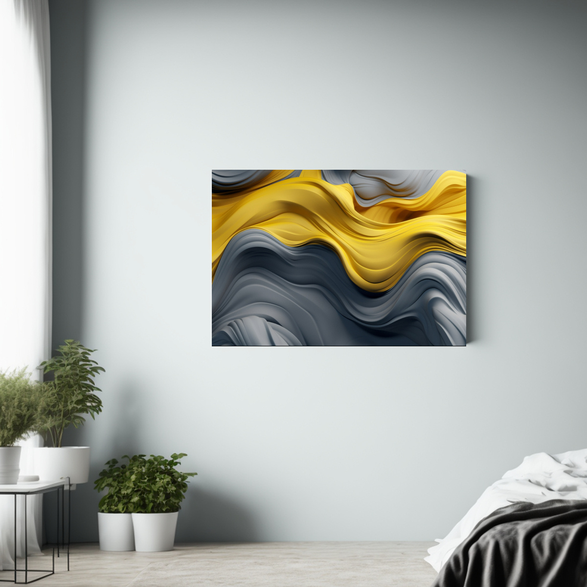 Este cuadro de fondo de onda líquida abstracta en tonos grisamarillo se vería espectacular en el salón principal de tu casa, justo encima de un sofá en tonos neutros Combínalo con cojines en tonos mostaza y gris para lograr un ambiente moderno y acogedor